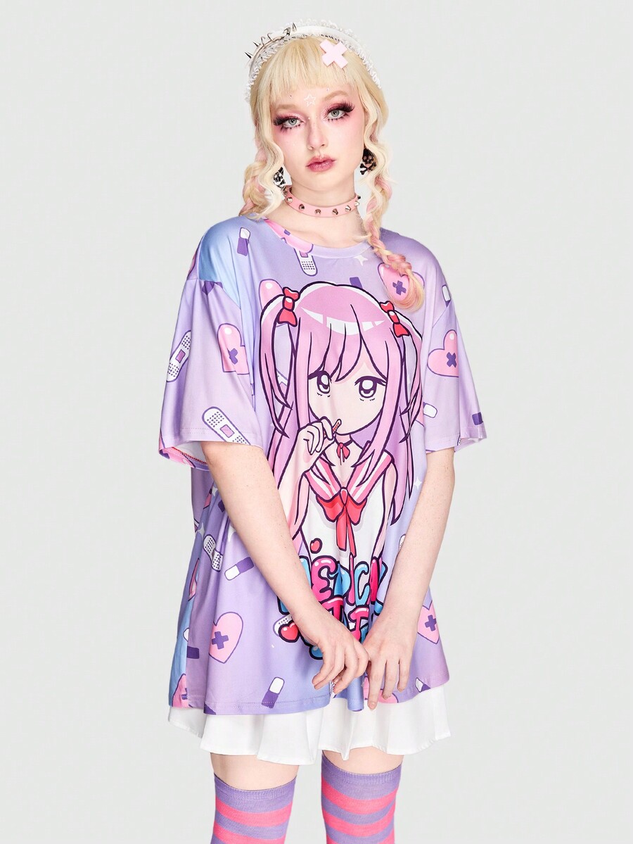 Anime Cartoon Figure Graphic Round Neck Drop Shoulder Tee