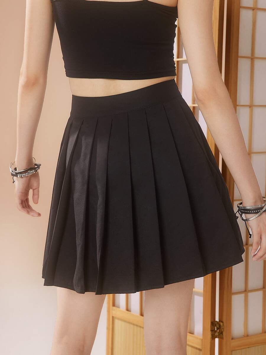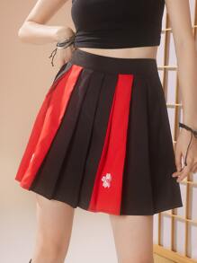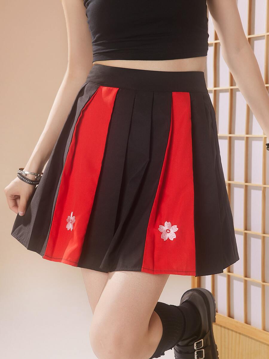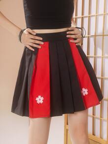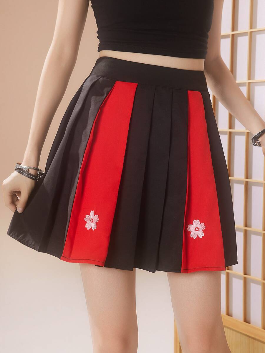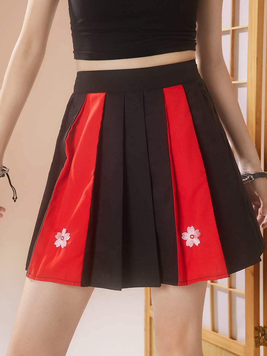 Anime Floral Embroidery Colorblock Pleated Skirt