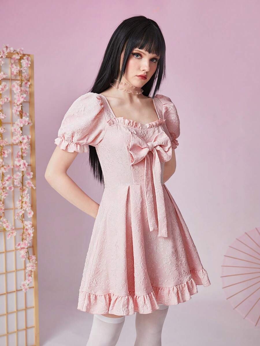 Anime Jacquard Bow Front Ruffle Hem Dress