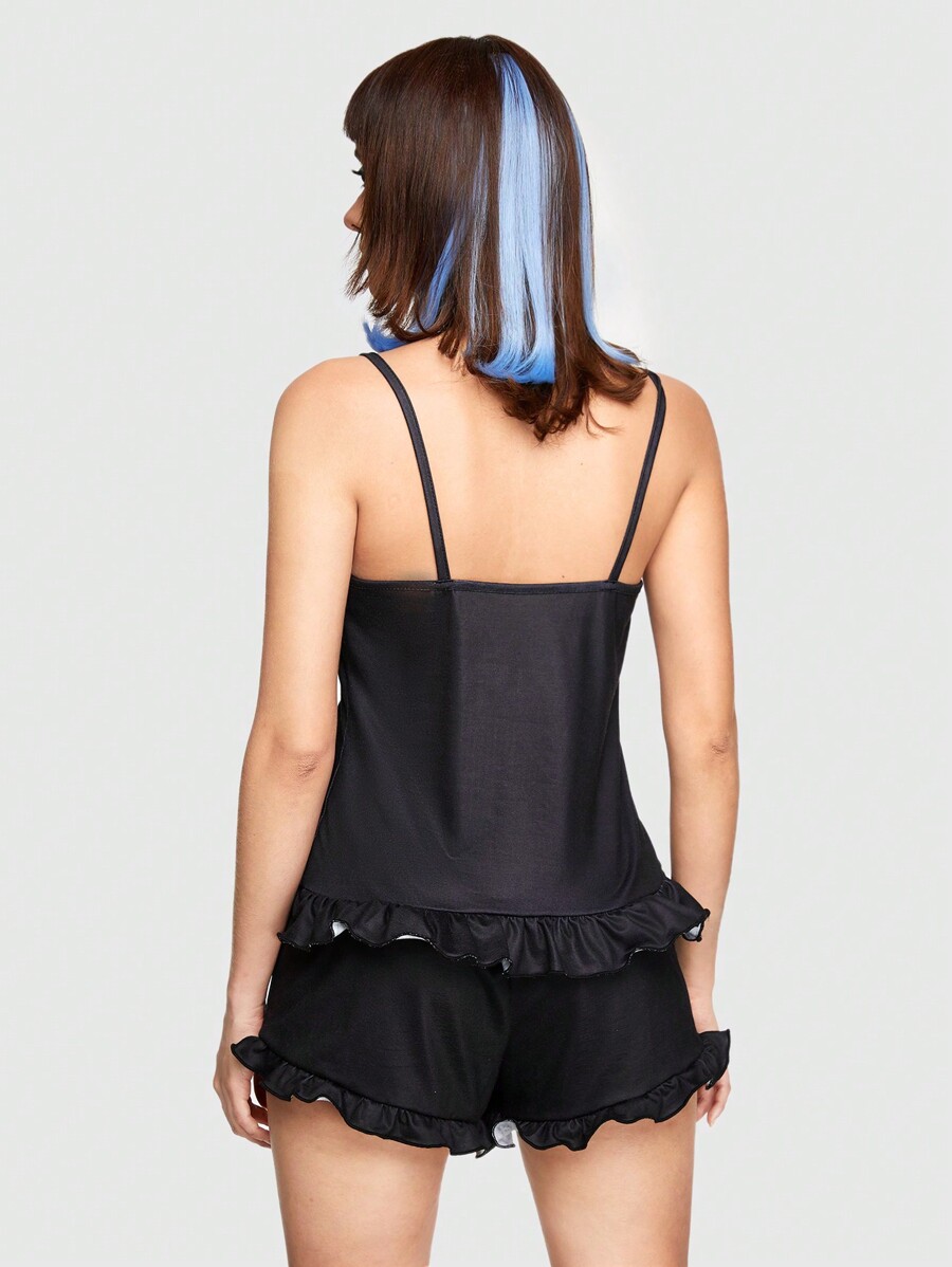 Anime Lace Spliced Color Block Ruffle Hem Cartoon Printed Cami Pajama Set