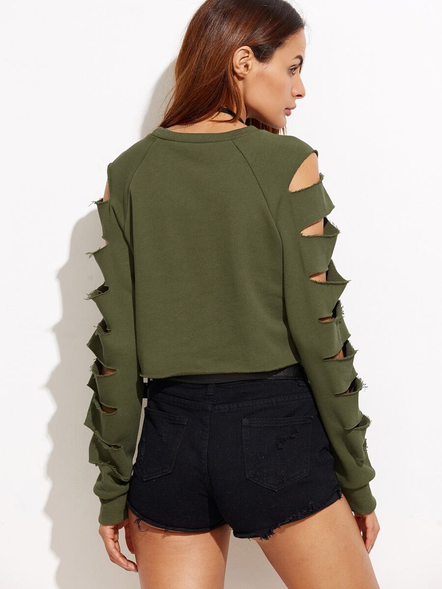 Army Green Ladder Cut Out Sleeve Raw Hem Sweatshirt