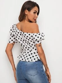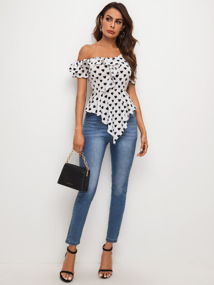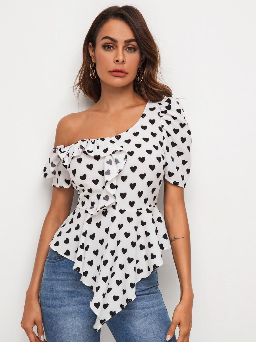 Asymmetrical Neck Heart Print Peplum Top