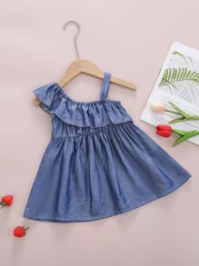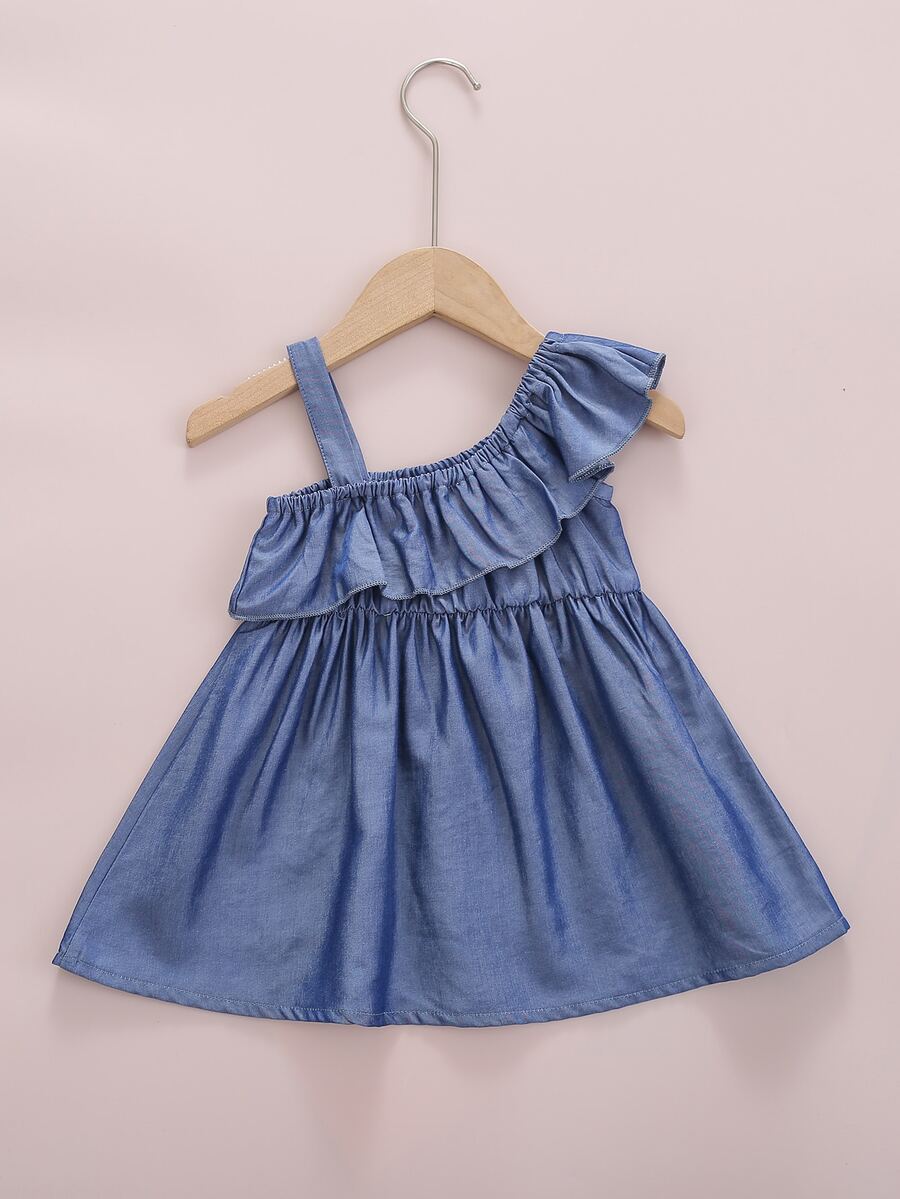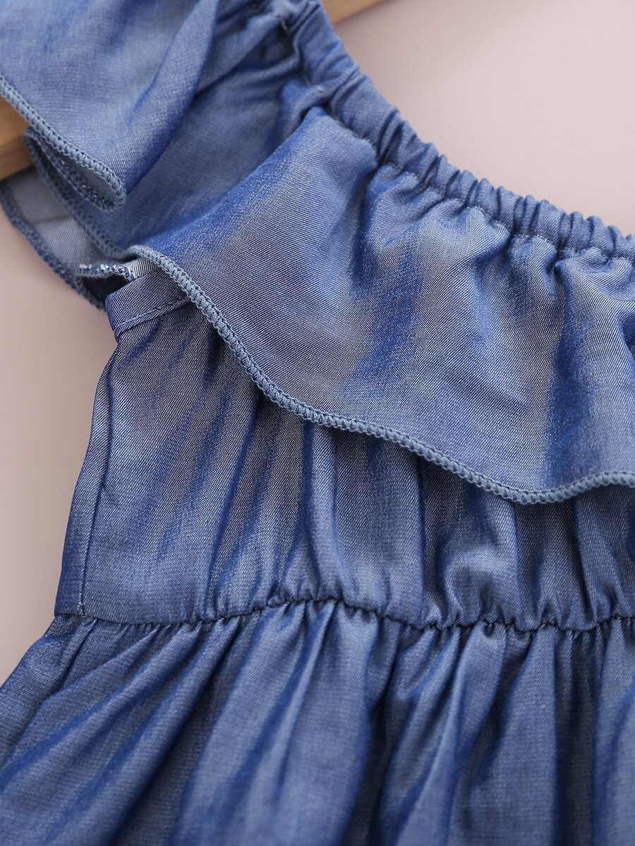 Baby Girl Ruffle Trim Asymmetrical Neck Denim Dress