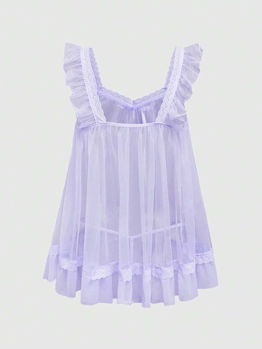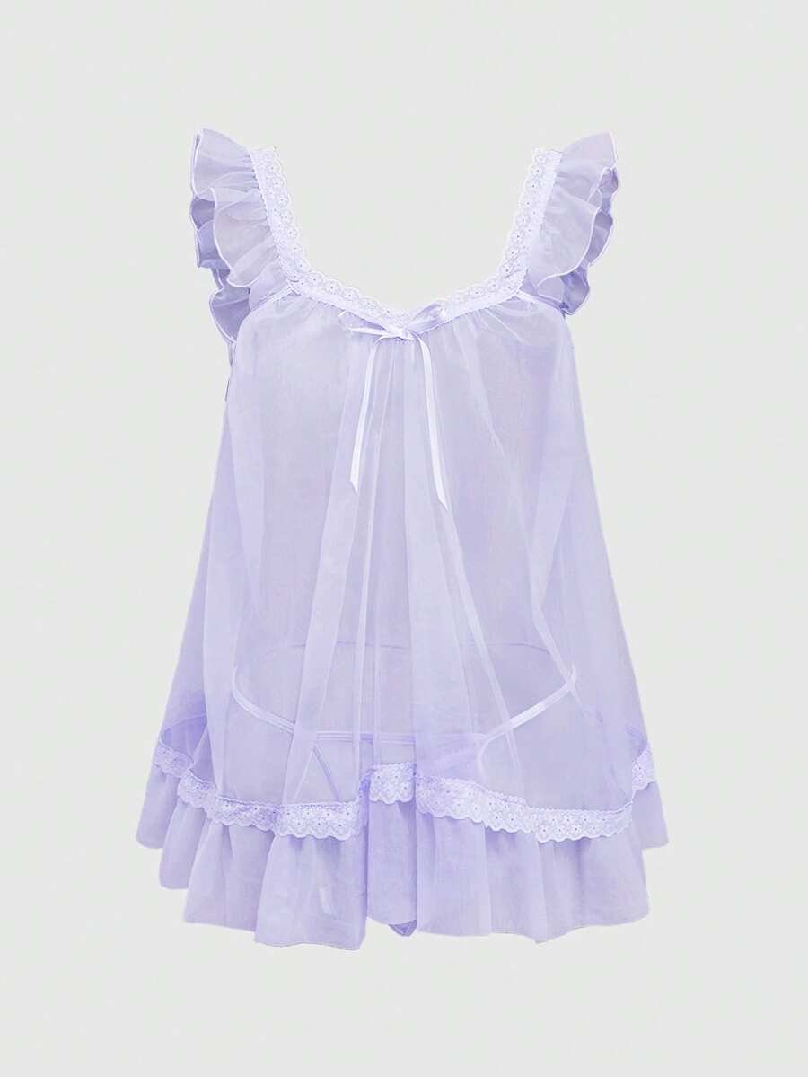 Babydoll Kawaii Cute Loose Sheer Dress, Mesh Lace Patchwork Bow Mini Dress, Sexy Tulle Dress Set