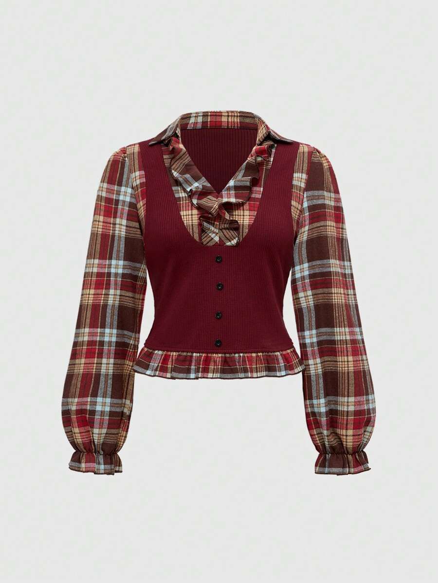 Back To School Vintage Gothic Plaid Patchwork Long Sleeve Shirt Blouse For Plus Size Women