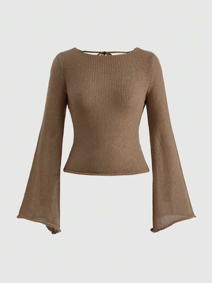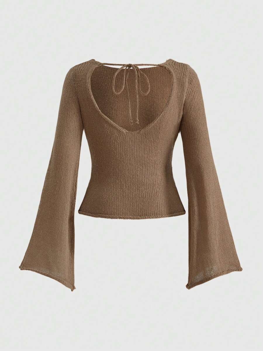 Backless Tie-Up Design Flare Sleeve Fitted Sheer Women Knit Top