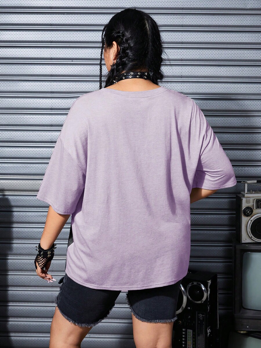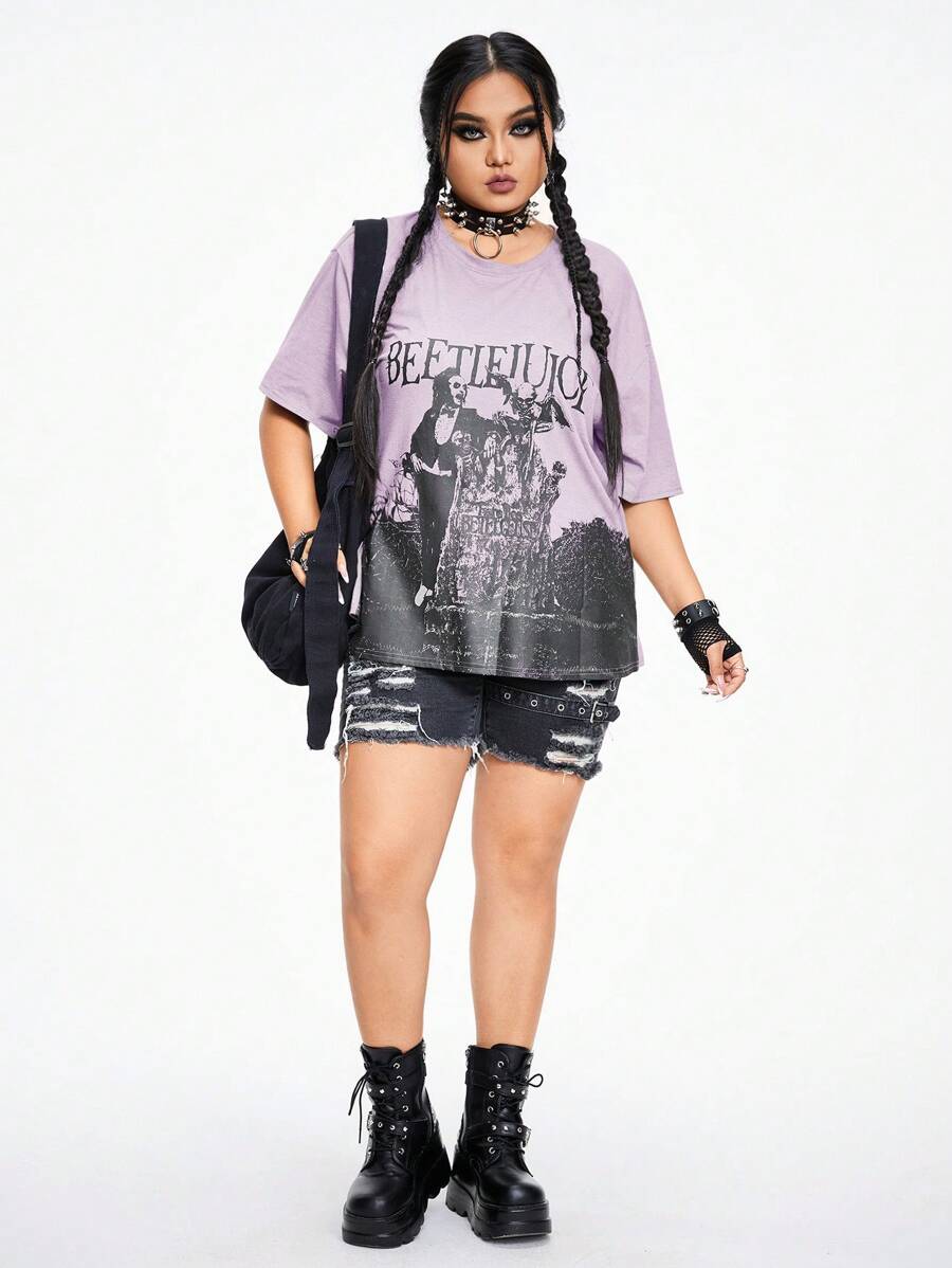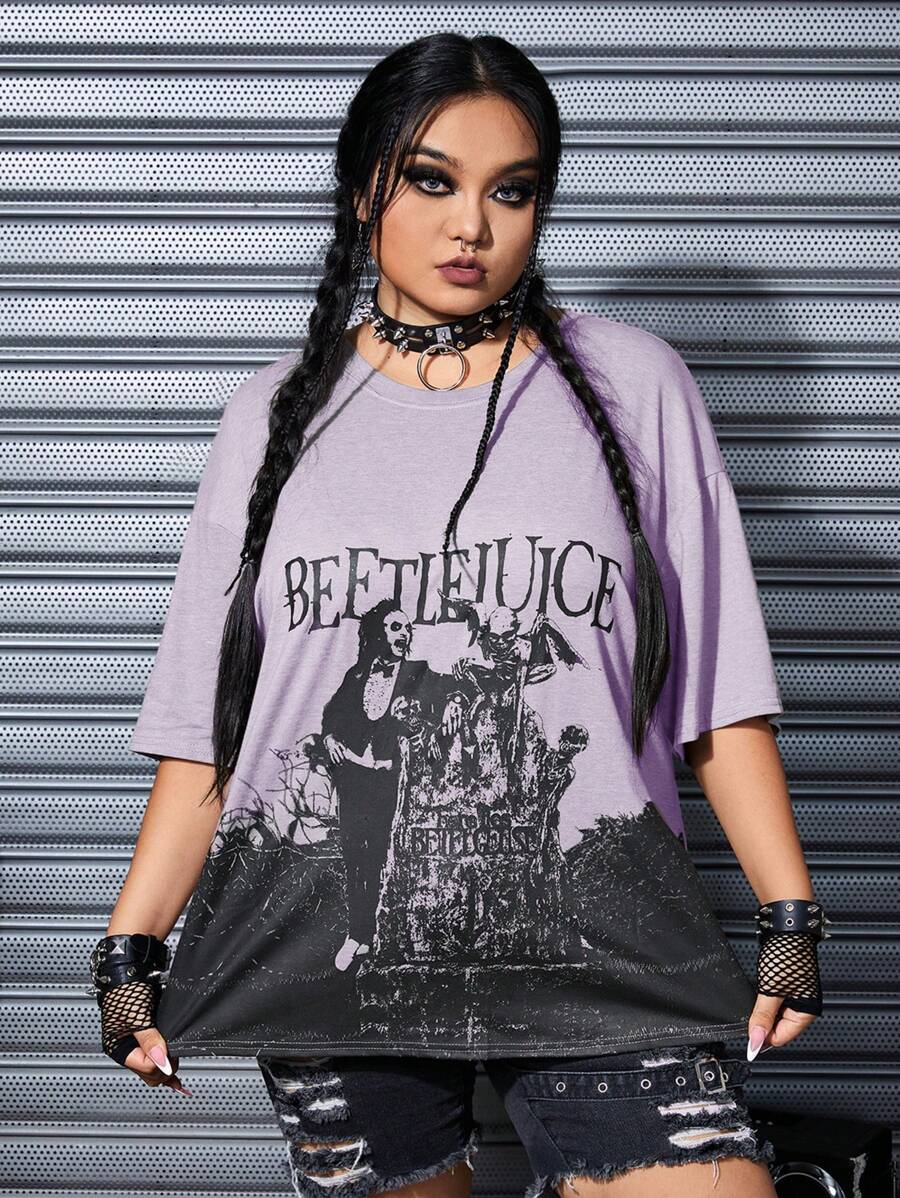 Beetlejuice | ROMWE Plus Size Women Casual Loose Letter & Figure Printed Short Sleeve T-Shirt, Summer,Graphic Tee