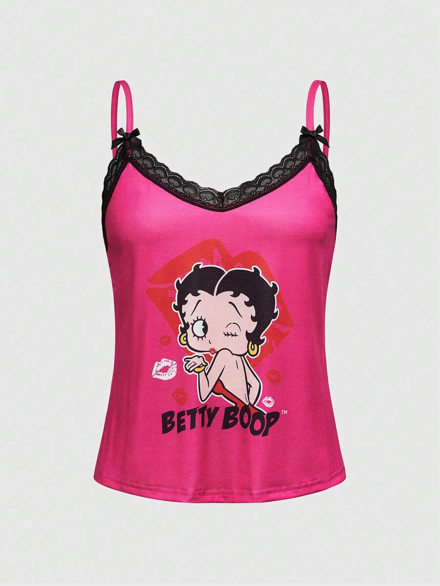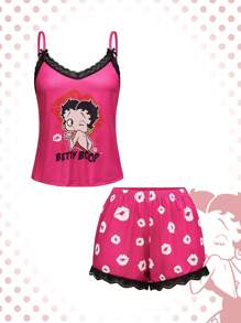 Betty Boop | ROMWE Women Contrast Lace Casual Comfortable Cami Top & Shorts Pajama Set