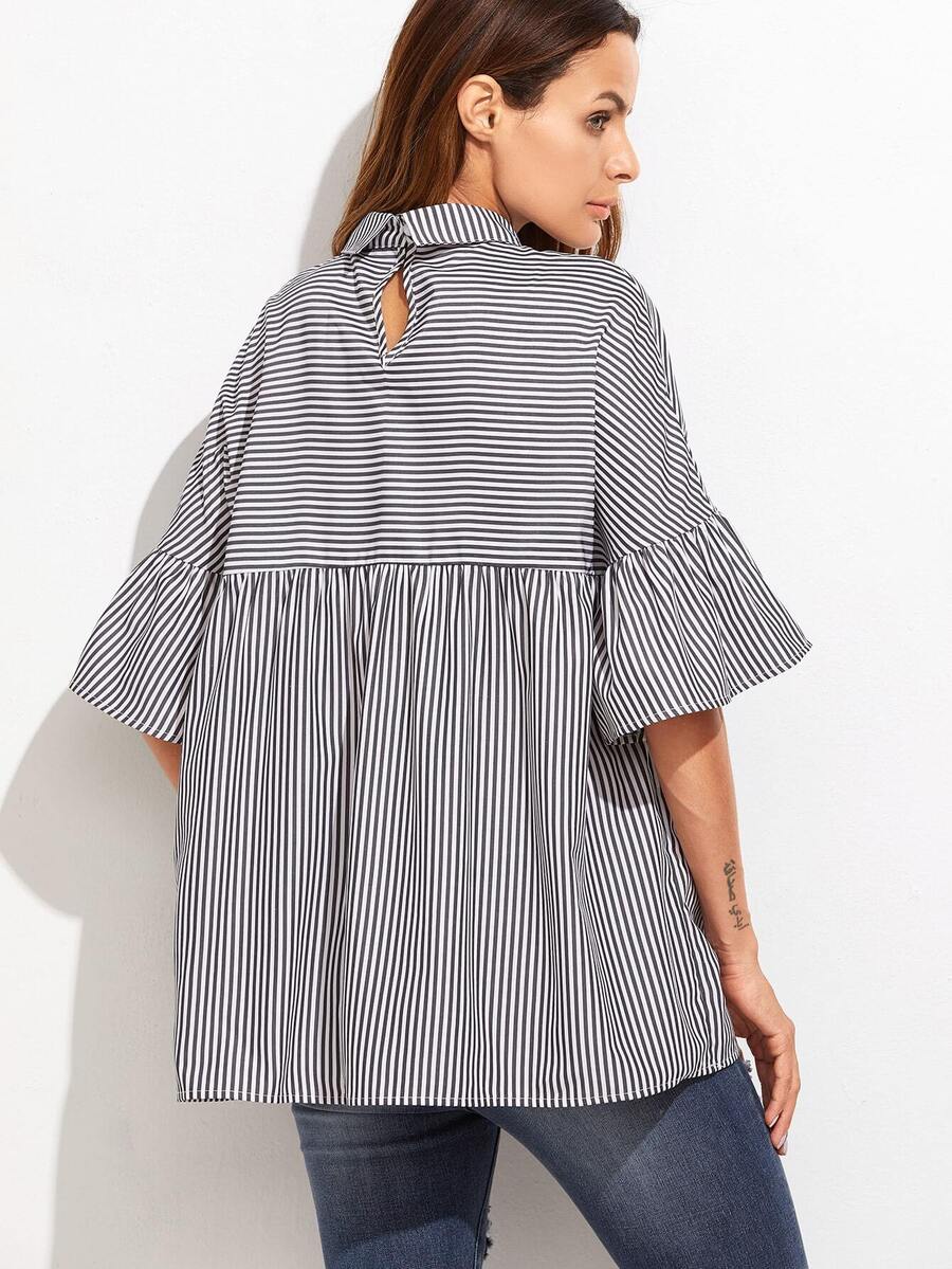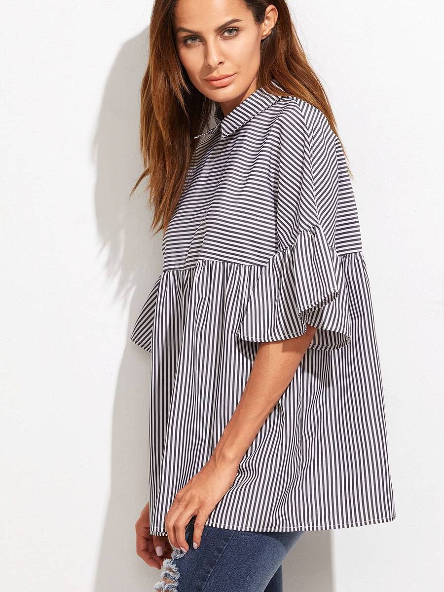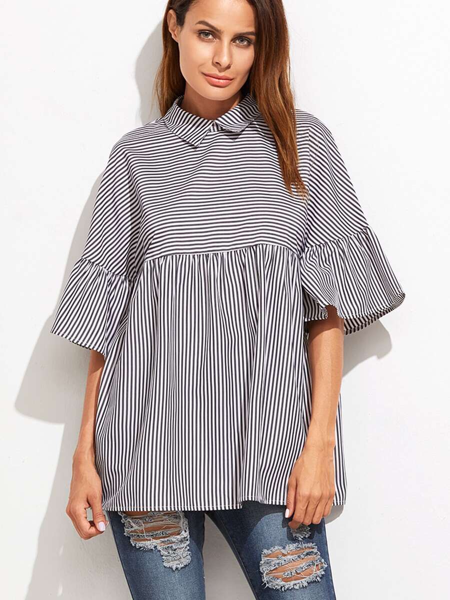 Black And White Striped Ruffle Sleeve Babydoll Top