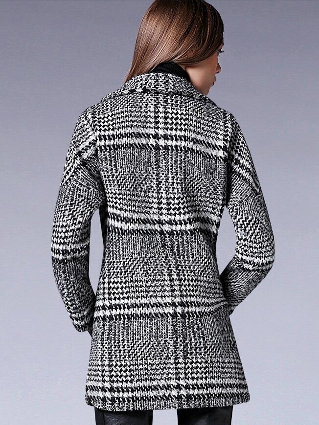 Black V Neck Long Sleeve Houndstooth Pockets Coat