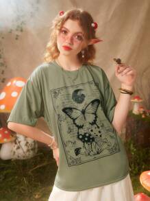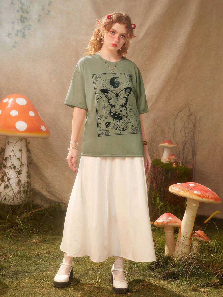 Fairycore Butterfly & Mushroom Print Drop Shoulder Tee