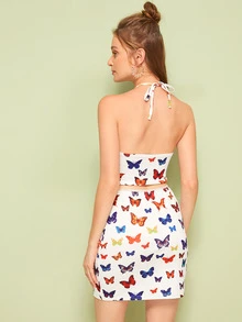 Butterfly Print Mesh Panel Halter Top With Pencil Skirt