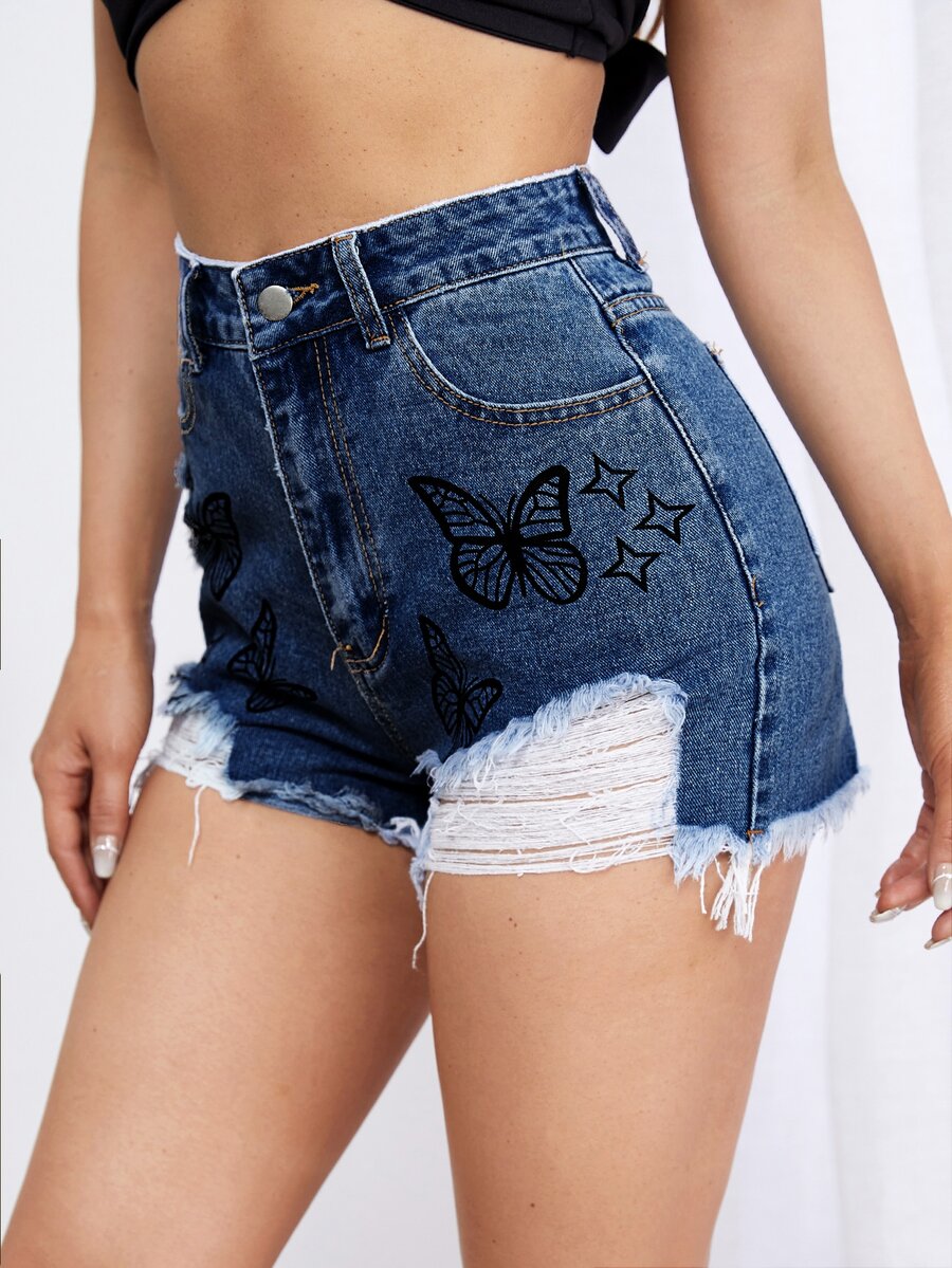 Butterfly Print Ripped Frayed Raw Hem Denim Shorts