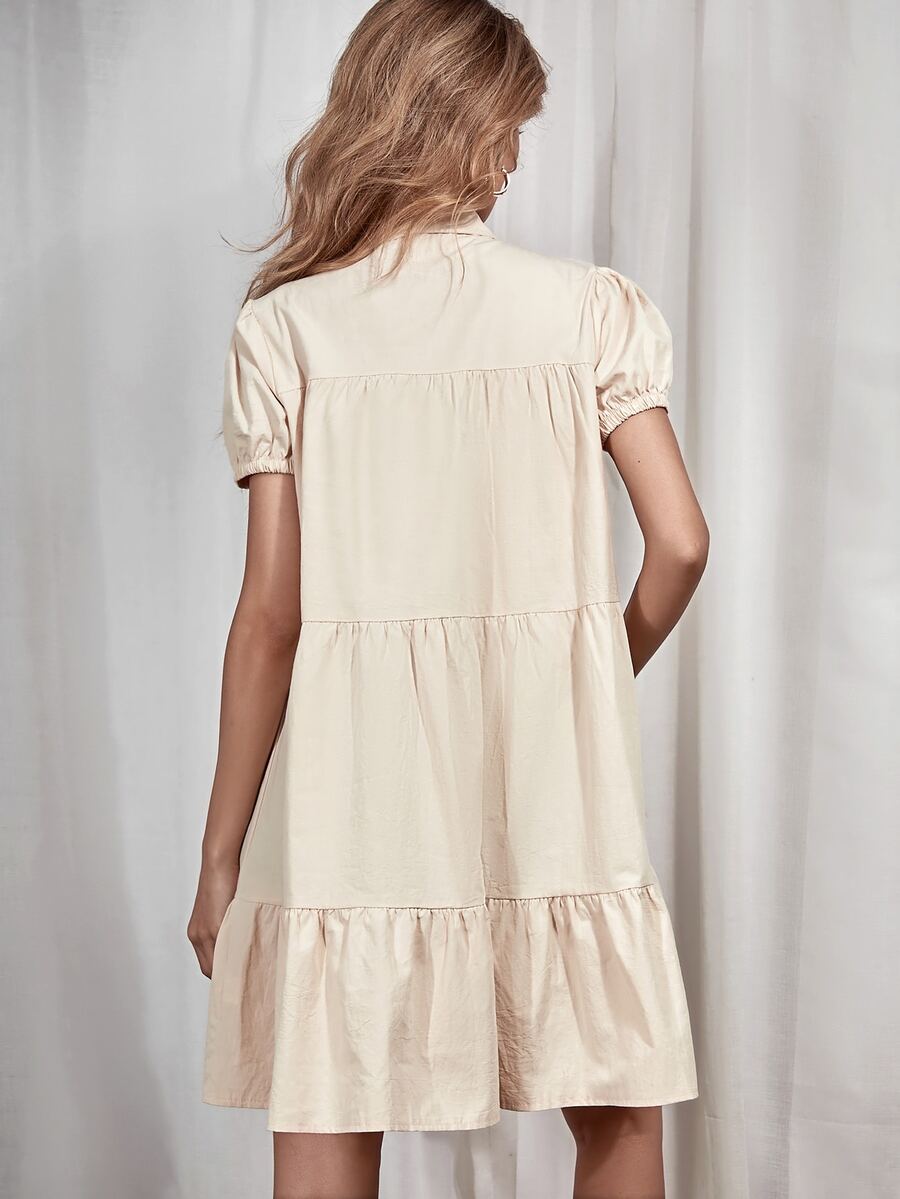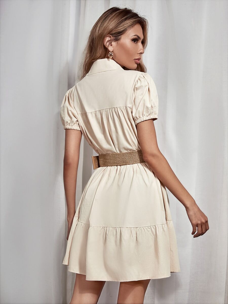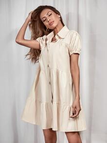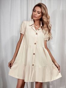 Button Front Puff Sleeve Shirt Smock Dress