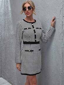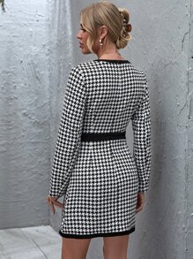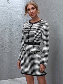 Button Front Zip Back Houndstooth Tweed Dress