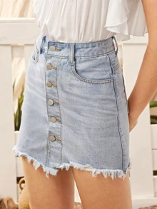 Button Through Raw Hem Faded Denim Skirt