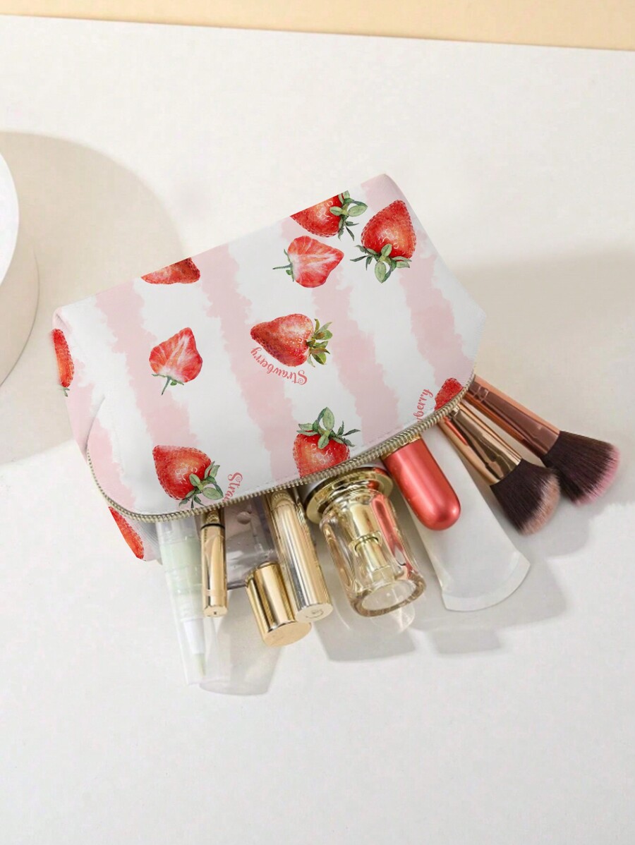 Kawaii Cartoon Summer Strawberry Print Large Capacity Cosmetic Bag With Inner Lining And Handle, Style 210342