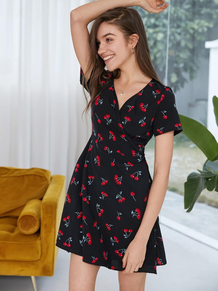 Cherry Print Wrap Tea Dress