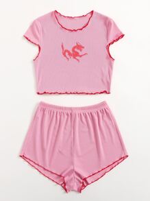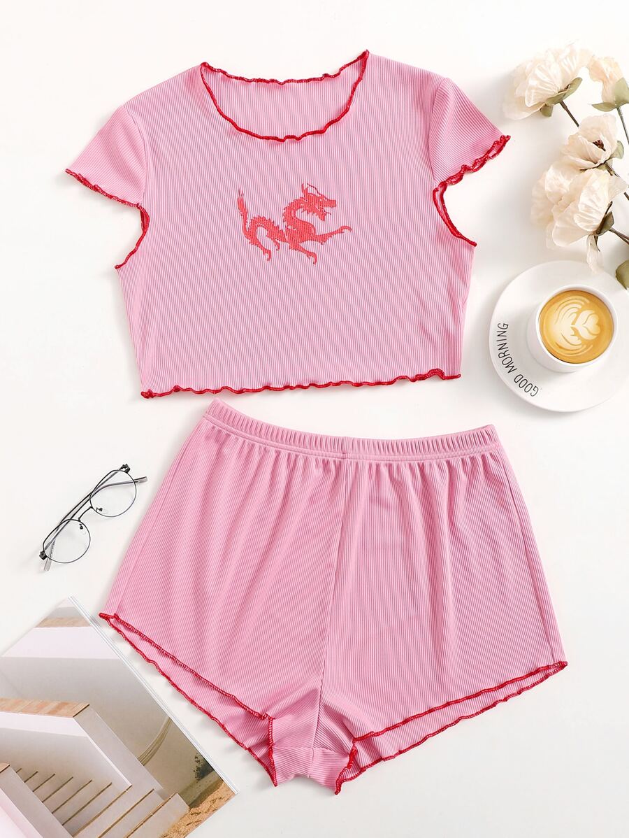 Chinese Dragon Print Lettuce Trim Shorts PJ Set