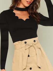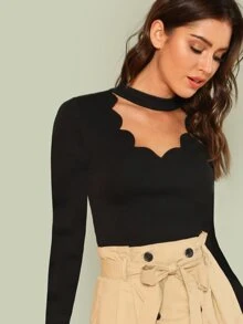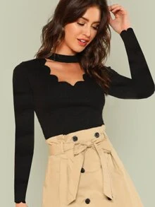 Choker V Neck Scallop Trim Tee