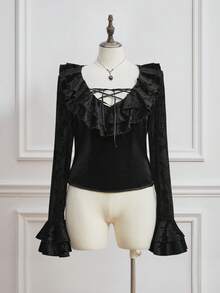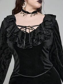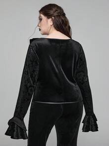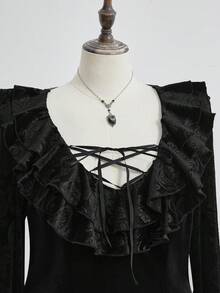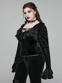 Goth Christmas Plus Size Black Double Layer Ruffle Collar Tie Neck Textured Velvet Pleated Shirt, Plus Size Autumn/Winter Black Velvet Textured Pleated Blouse With Flared Sleeves