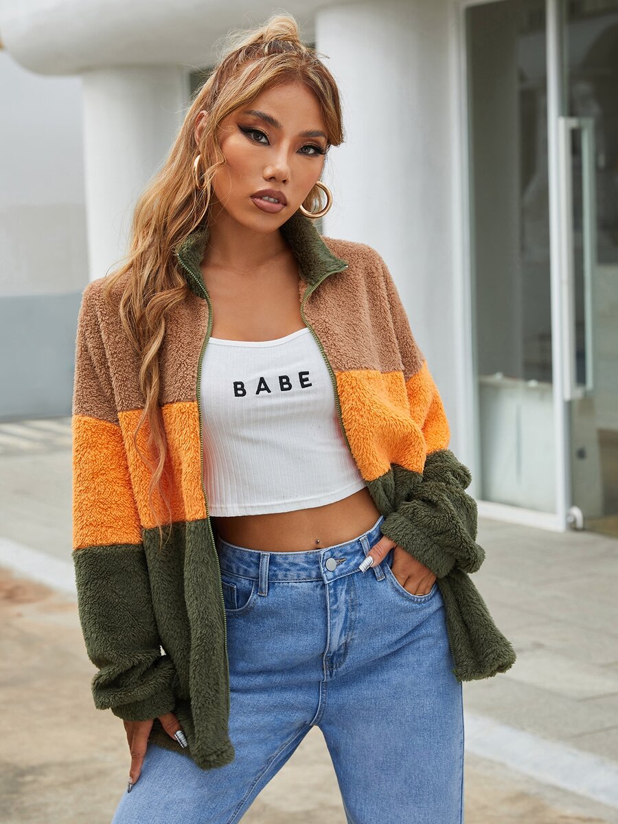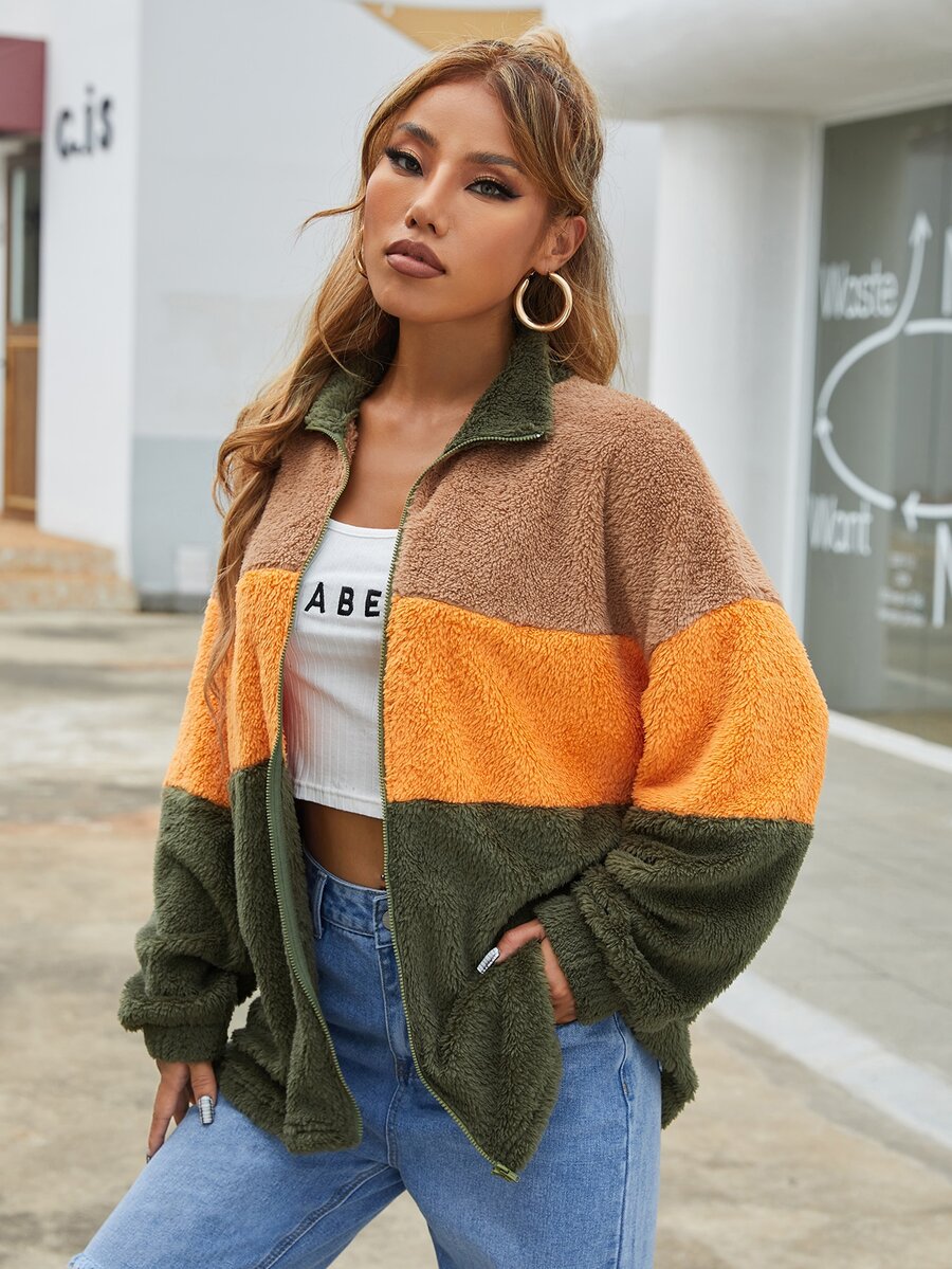 Colorblock Drop Shoulder Zipper Teddy Coat