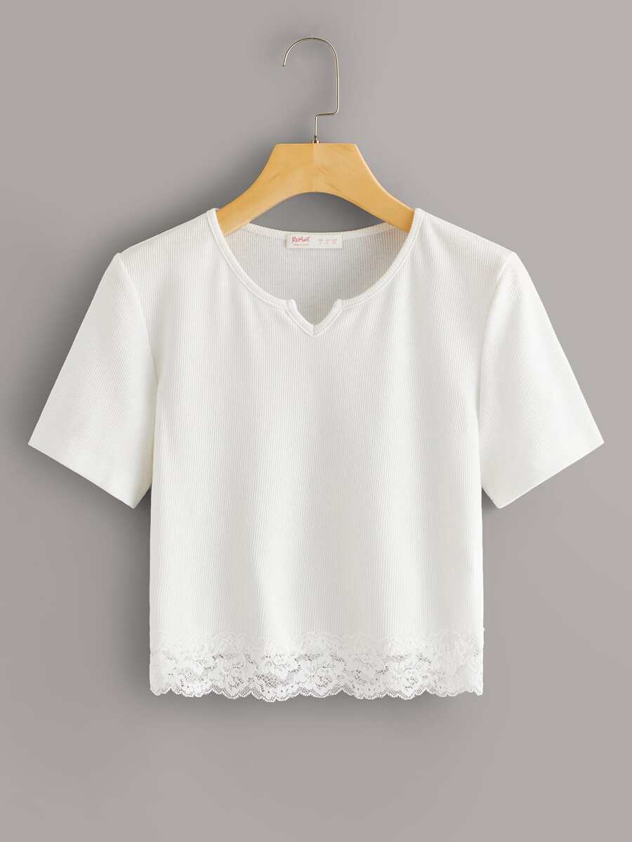 Contrast Lace Notch Neck Ribbed Tee