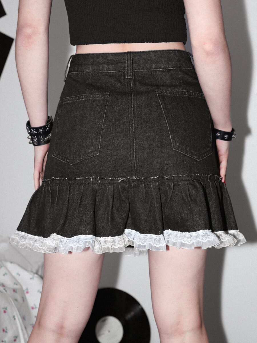 Contrast Lace Ruffle Hem Denim Skirt