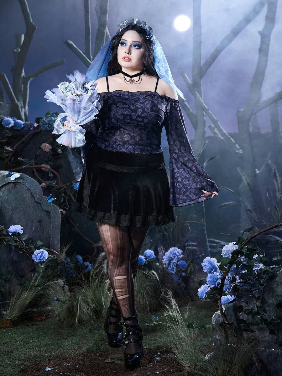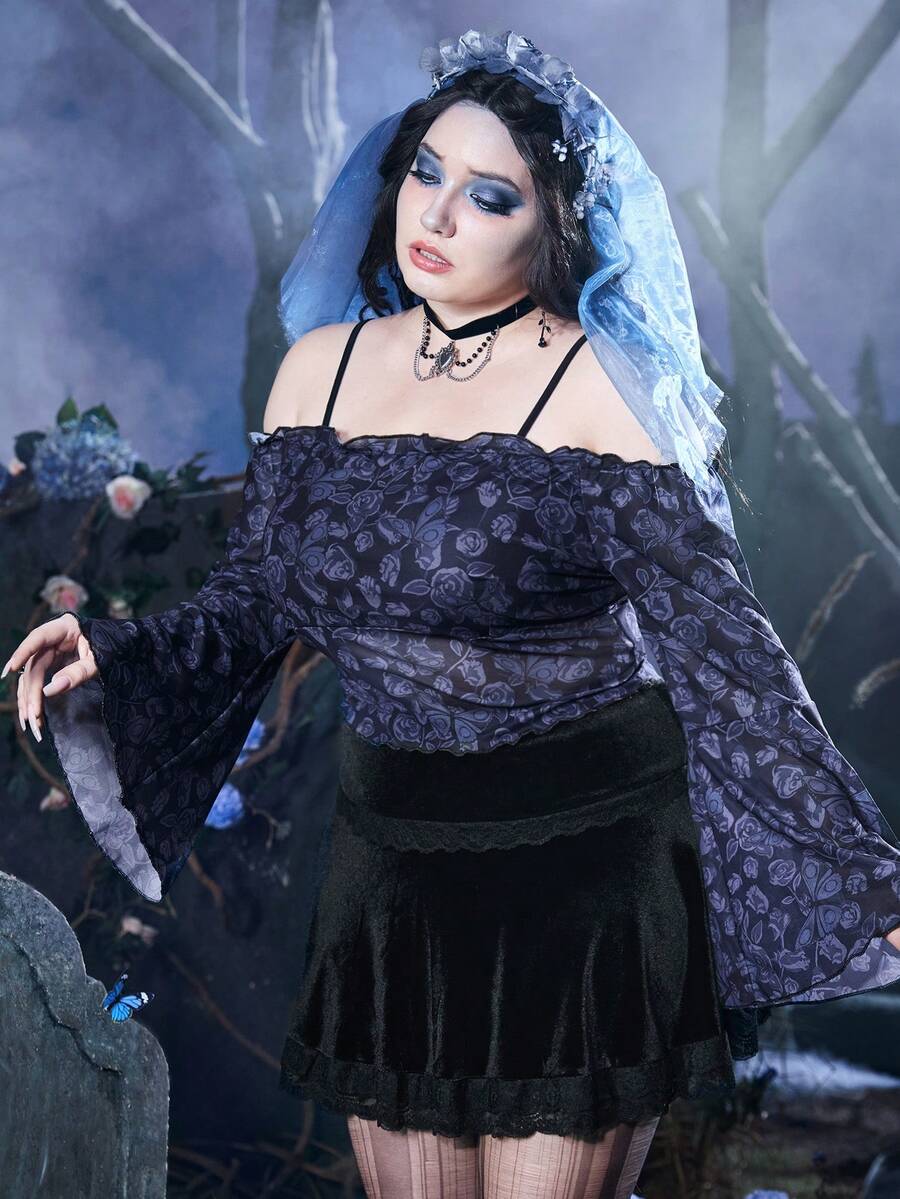 Corpse Bride | ROMWE Plus Butterfly & Floral Print Cold Shoulder Flounce Sleeve Mesh Top