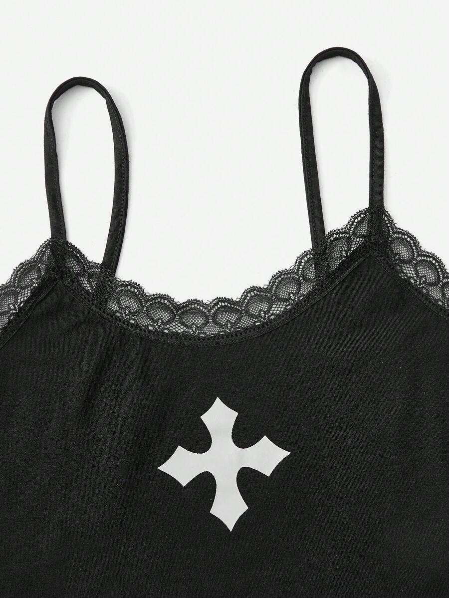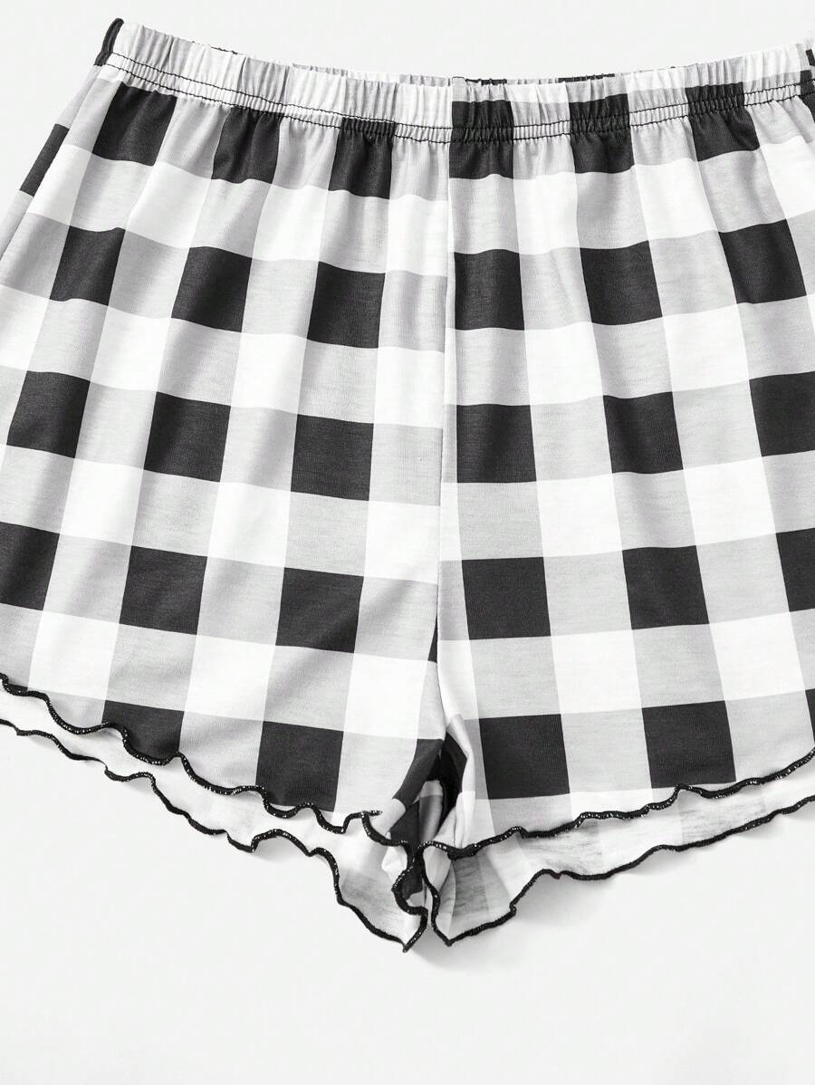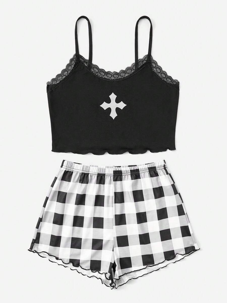 Cross Graphic Plaid Contrast Lace Lettuce Trim PJ Set