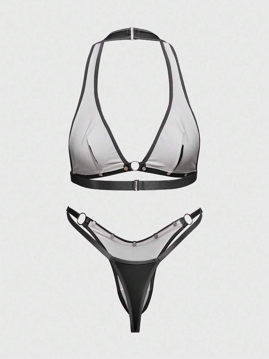 Grunge Punk Dark Punk PU Studded Bralette And Thong Lingerie Set, Sexy