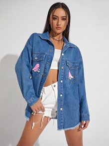 Dinosaur Print Raw Hem Flap Pocket Denim Jacket