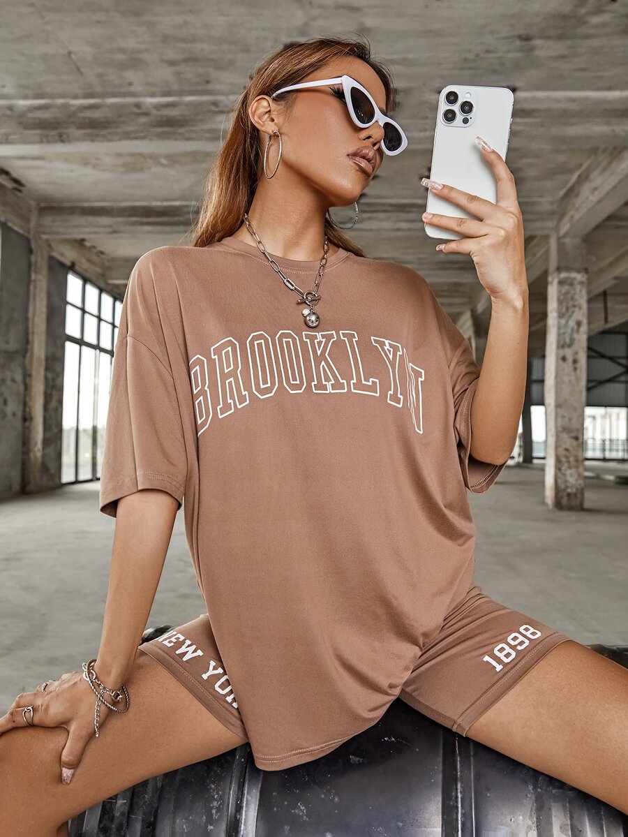Drop Shoulder Letter Graphic Top And Biker Shorts Set