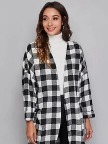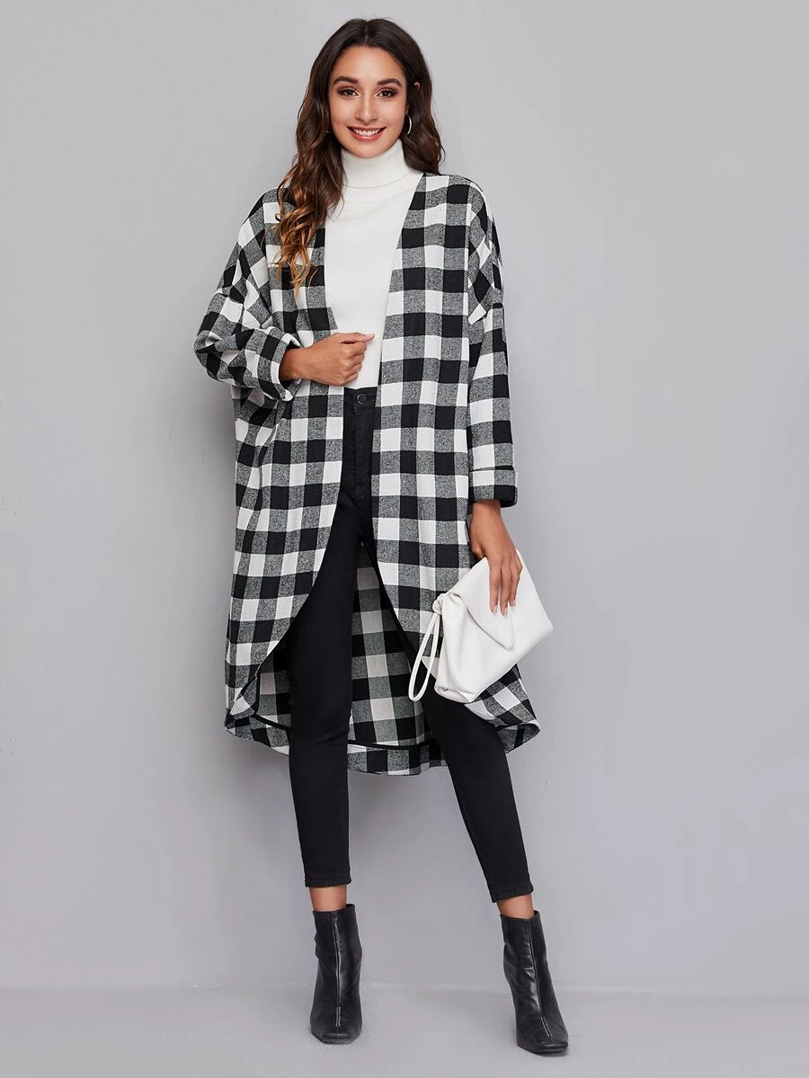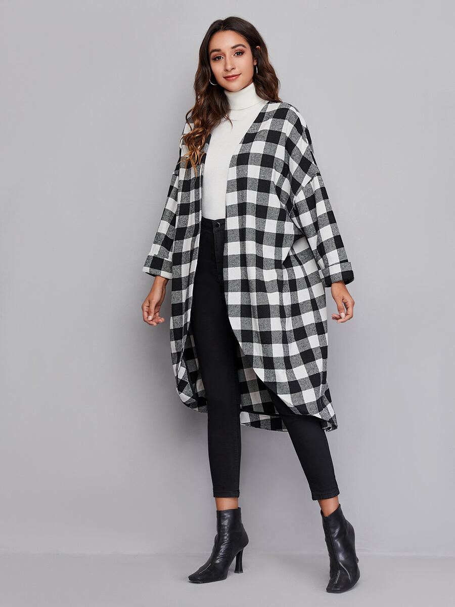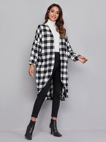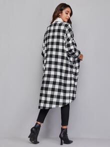 Drop Shoulder Open Front Dip Hem Buffalo Plaid Coat