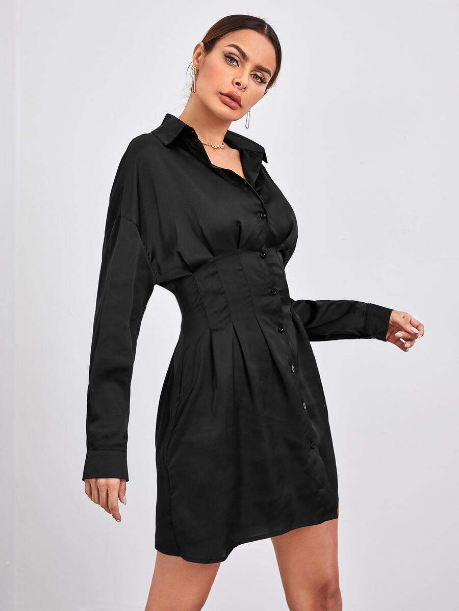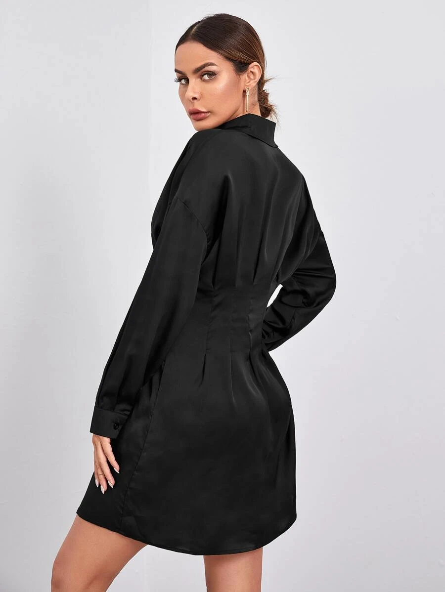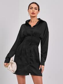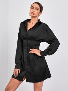 Drop Shoulder Single Breasted Satin Shirt Dress