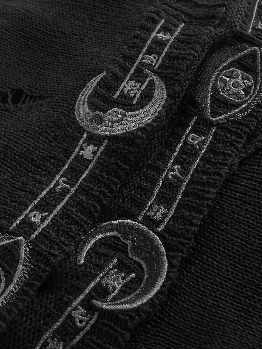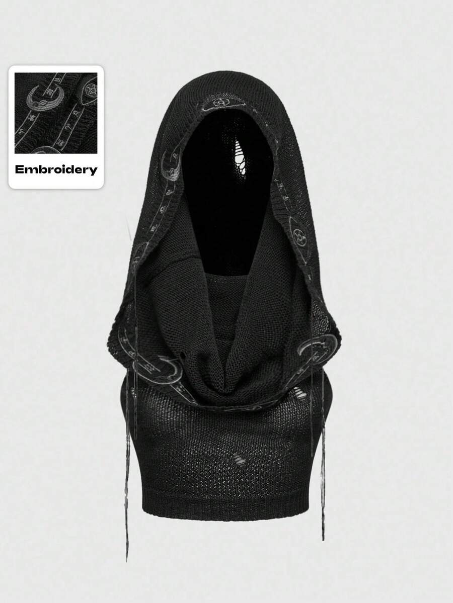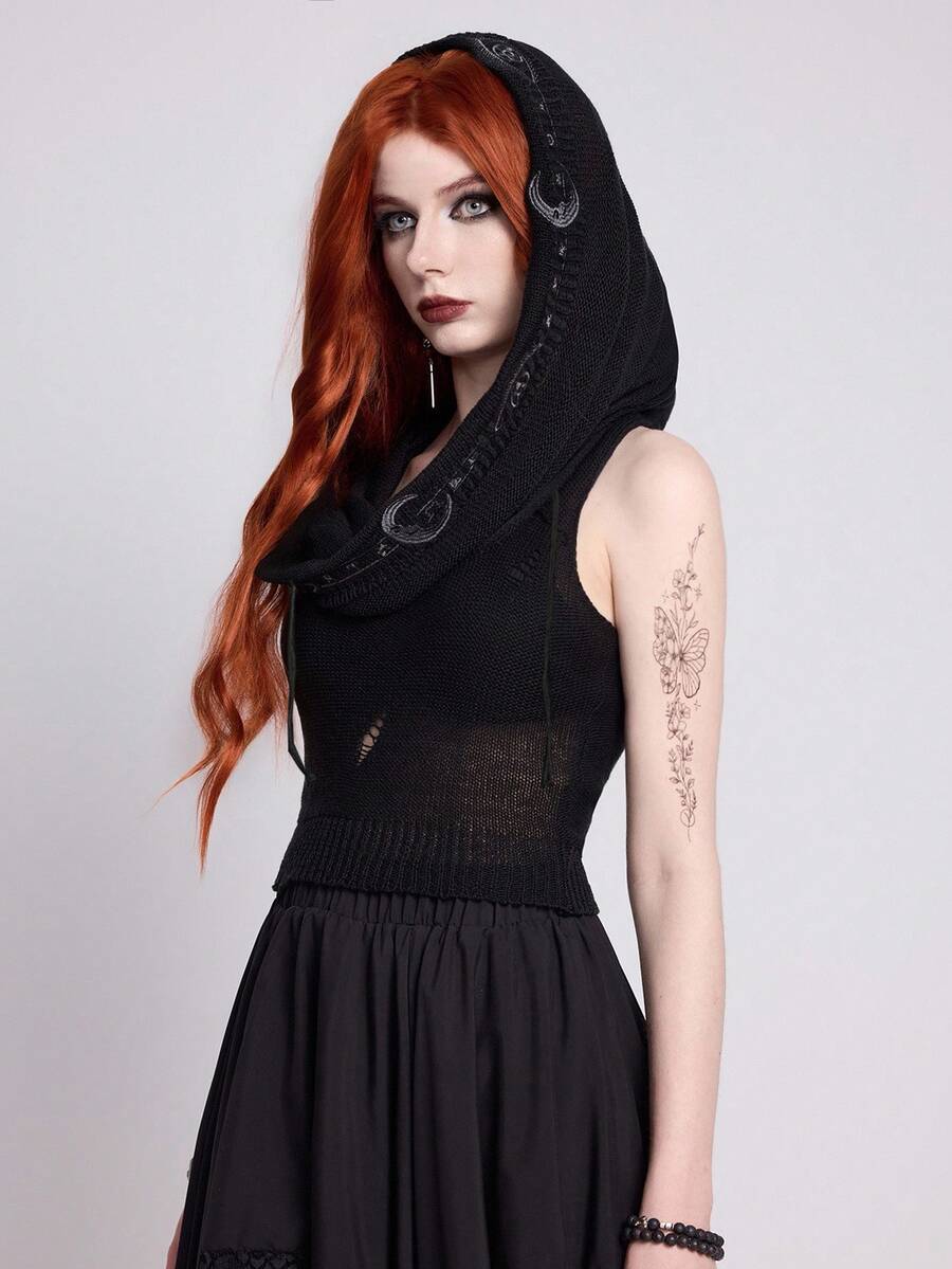EDITION Boho Goth Style Mystical Embroidered Hooded Cropped Tasseled Knitted Sweater For Women