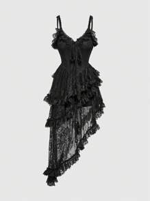 EDITION Gothic Asymmetrical Asymmetric Hem Multi-Layer Lace Splicing V-Neck Belted Women's Mid-Calf Dress