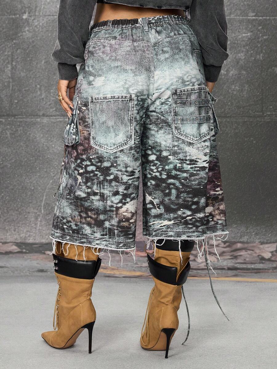 EDITION Plus Size Street Punk Heavily Distressed Print Loose Women Denim Bermuda Shorts