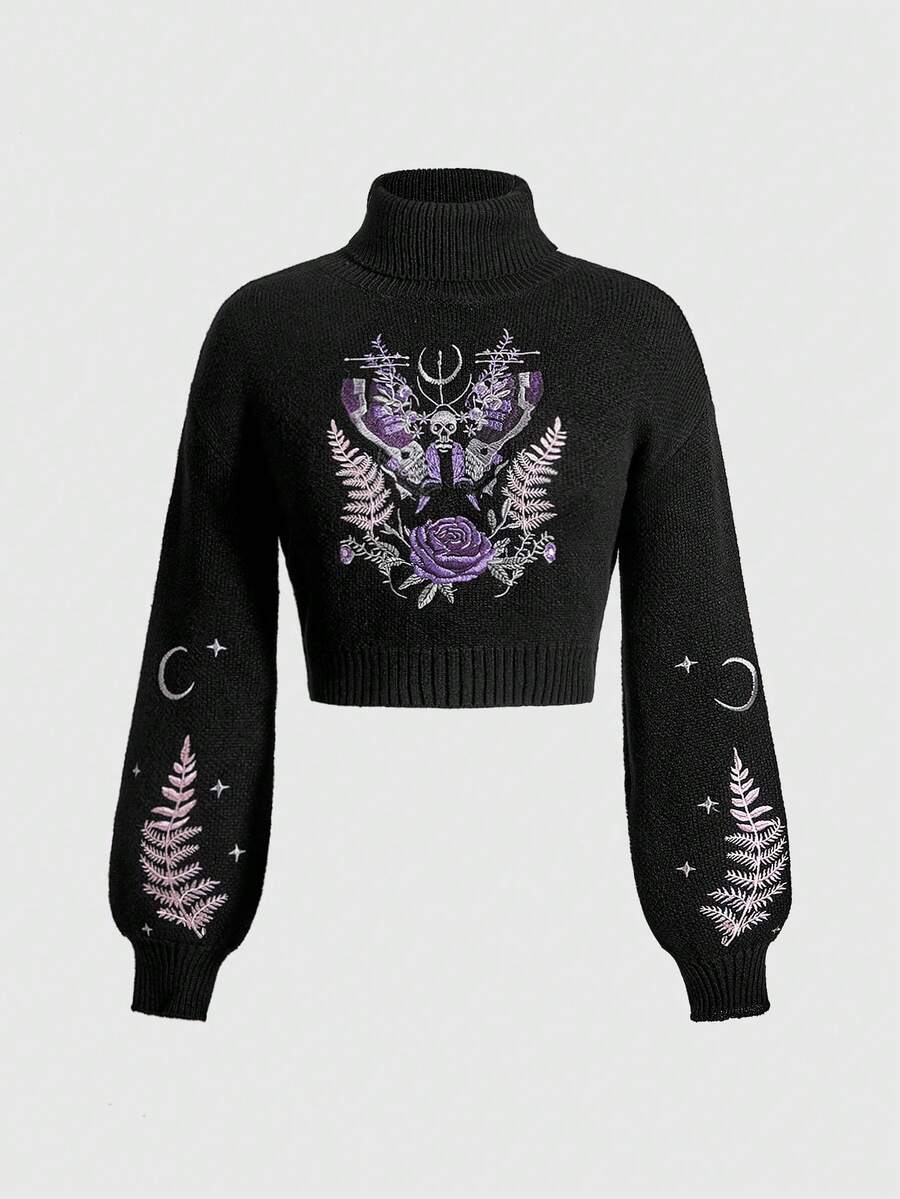 Fairycore Fairy-Style Moth, Butterfly, Rose Flower, Plant, Moon & Star Embroidery Women's Turtleneck Sweater