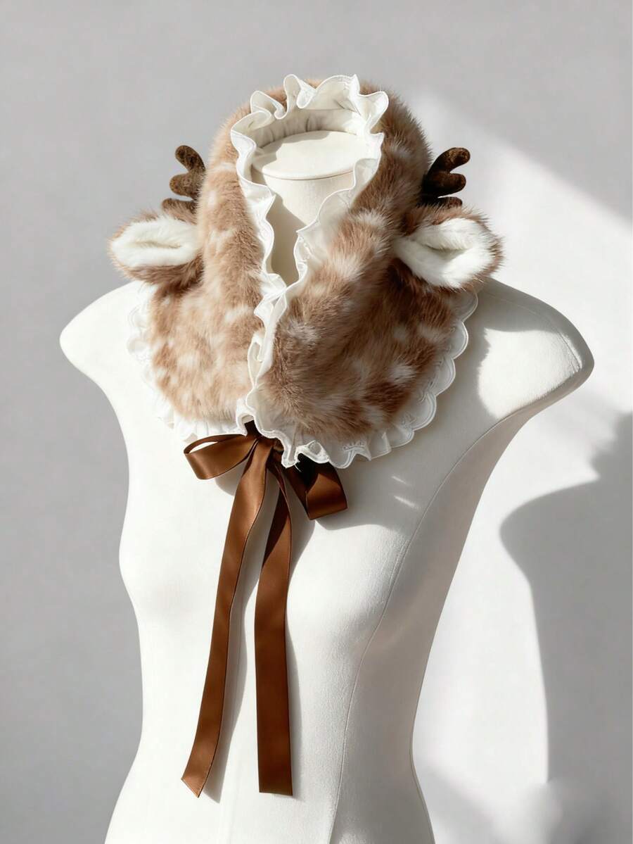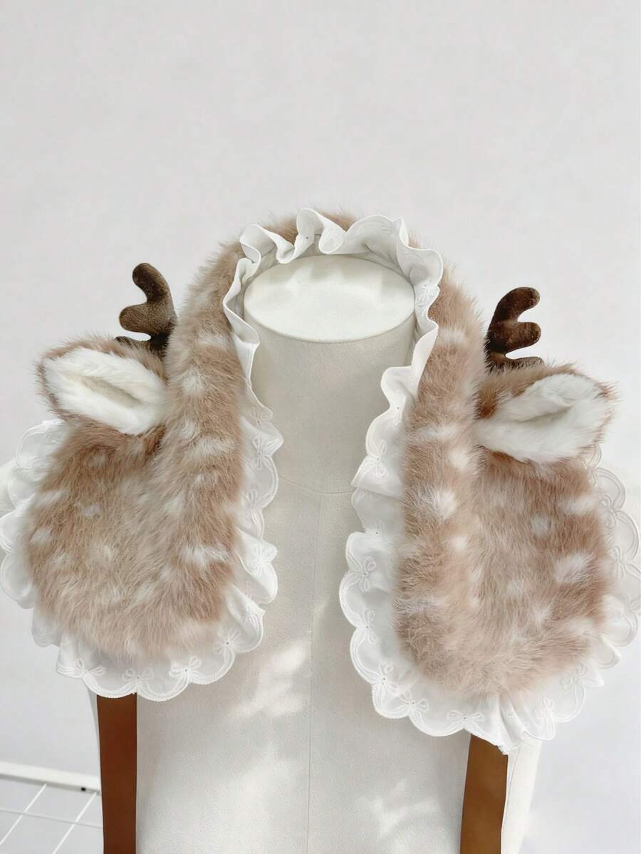 Fairycore 1pc Adorable Deer Design Plush Shawl, Sweet Lace Ruffle Bowknot Scarf, Warm Fashion Neck Accessories For Autumn/Winter