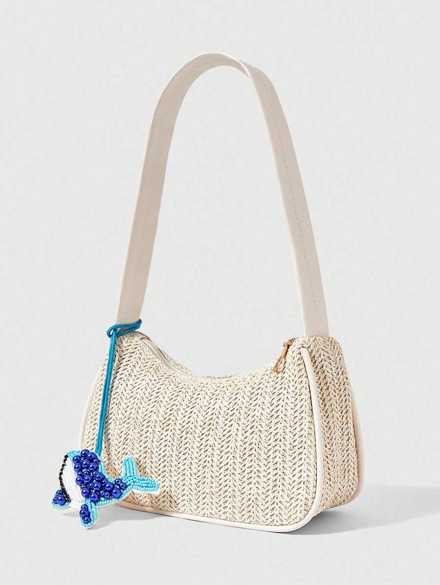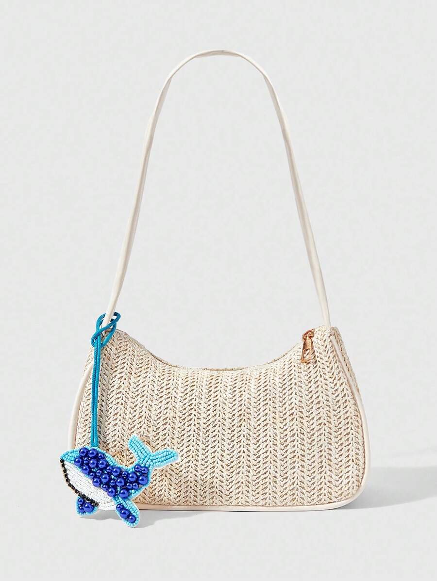 Fairycore 1pc Bohemian Style Beach Bag, Hollow Out Net Tote Bag For Women, Suitable For Vacation, Comes With Hanging Decoration & Tropical Floral Embellishment