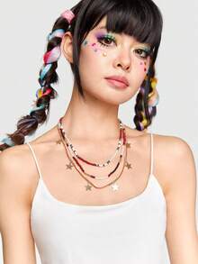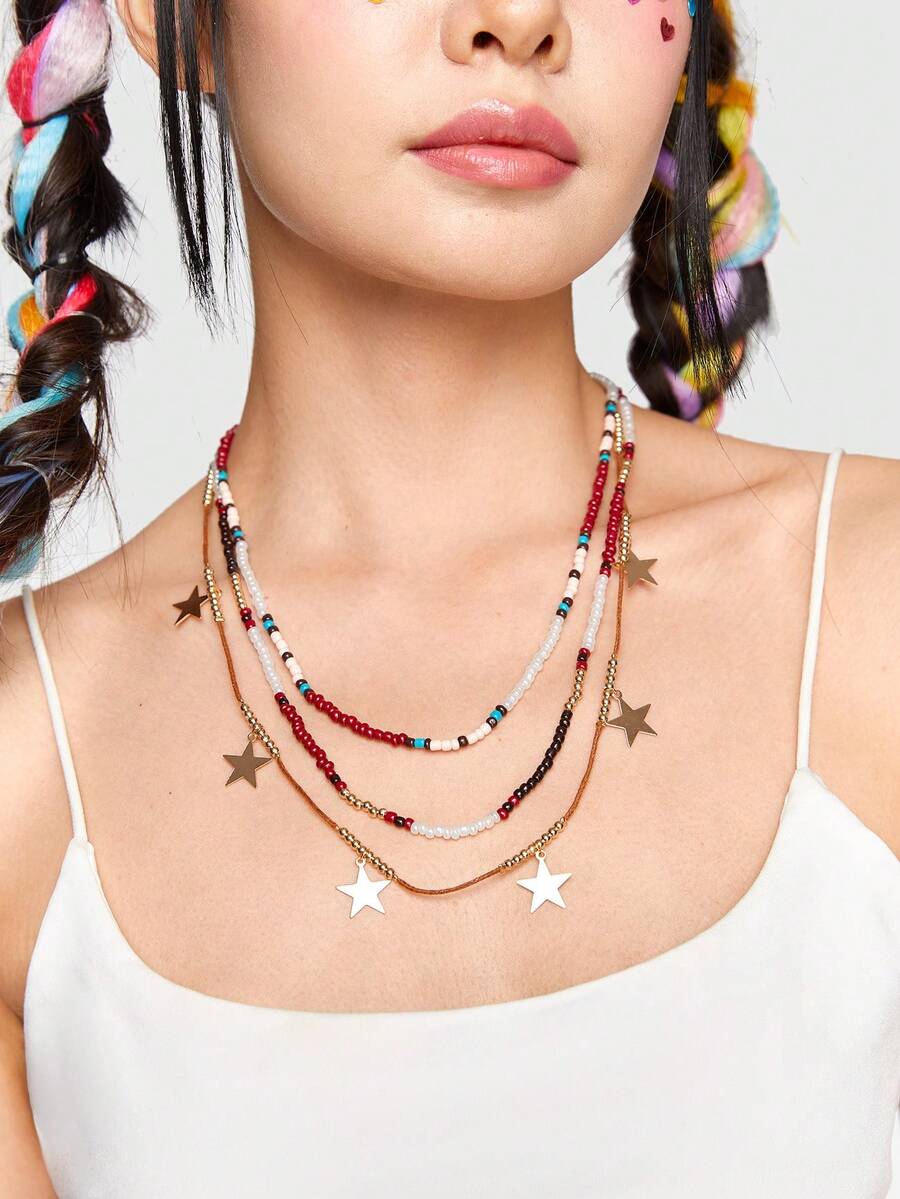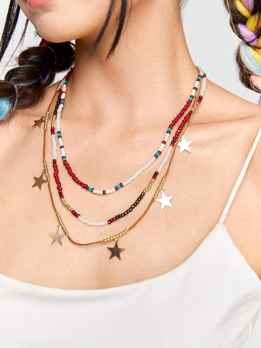 Fairycore 1pc Fashionable Bohemian Style Star Pendant Multilayer Beaded Chain Necklace