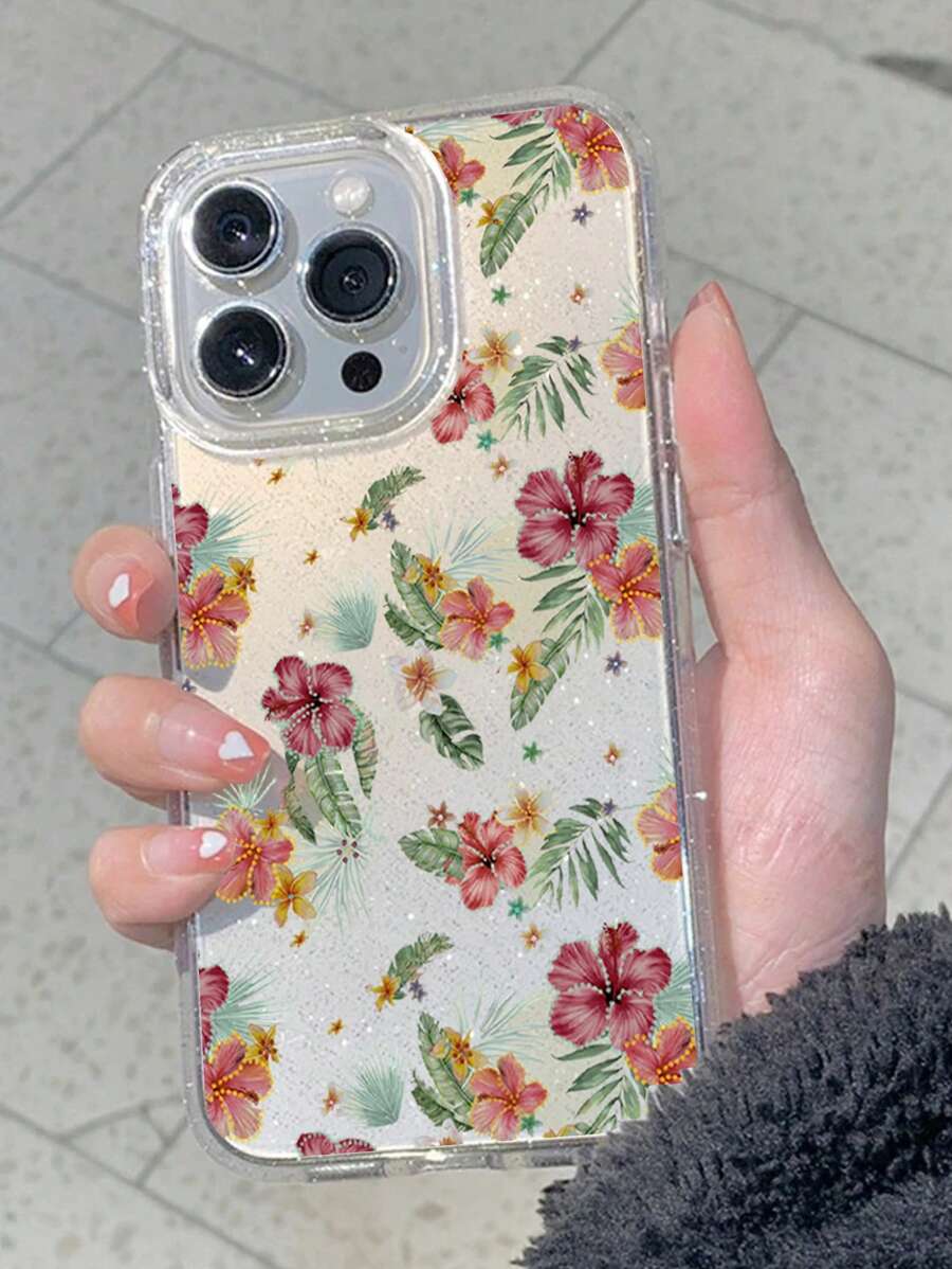 Fairycore 1pc Floral Pattern Glitter Transparent Phone Case Compatible With Iphone 11 12 13 14 15 Pro Max 16