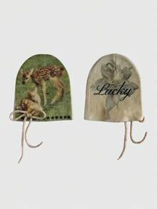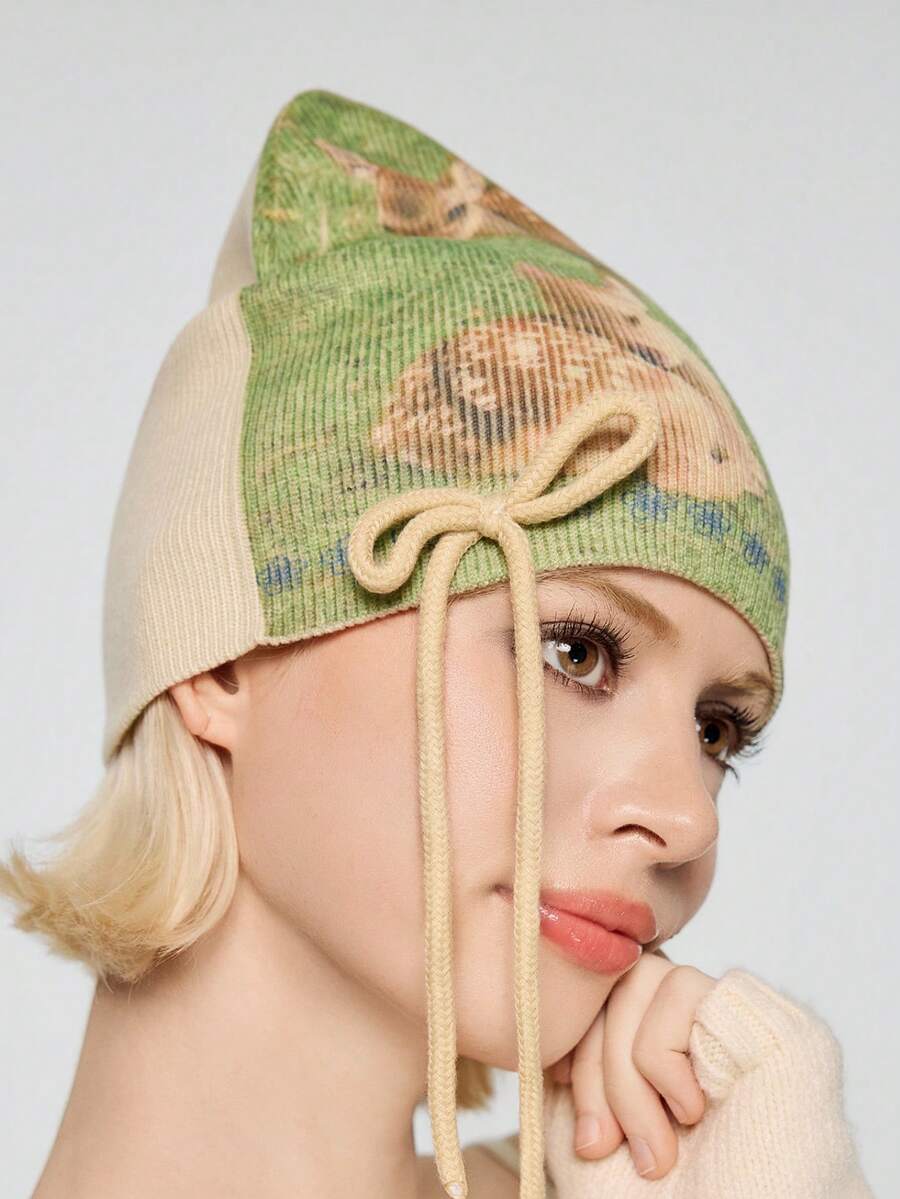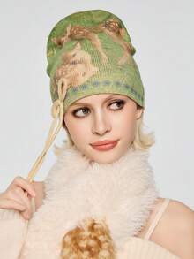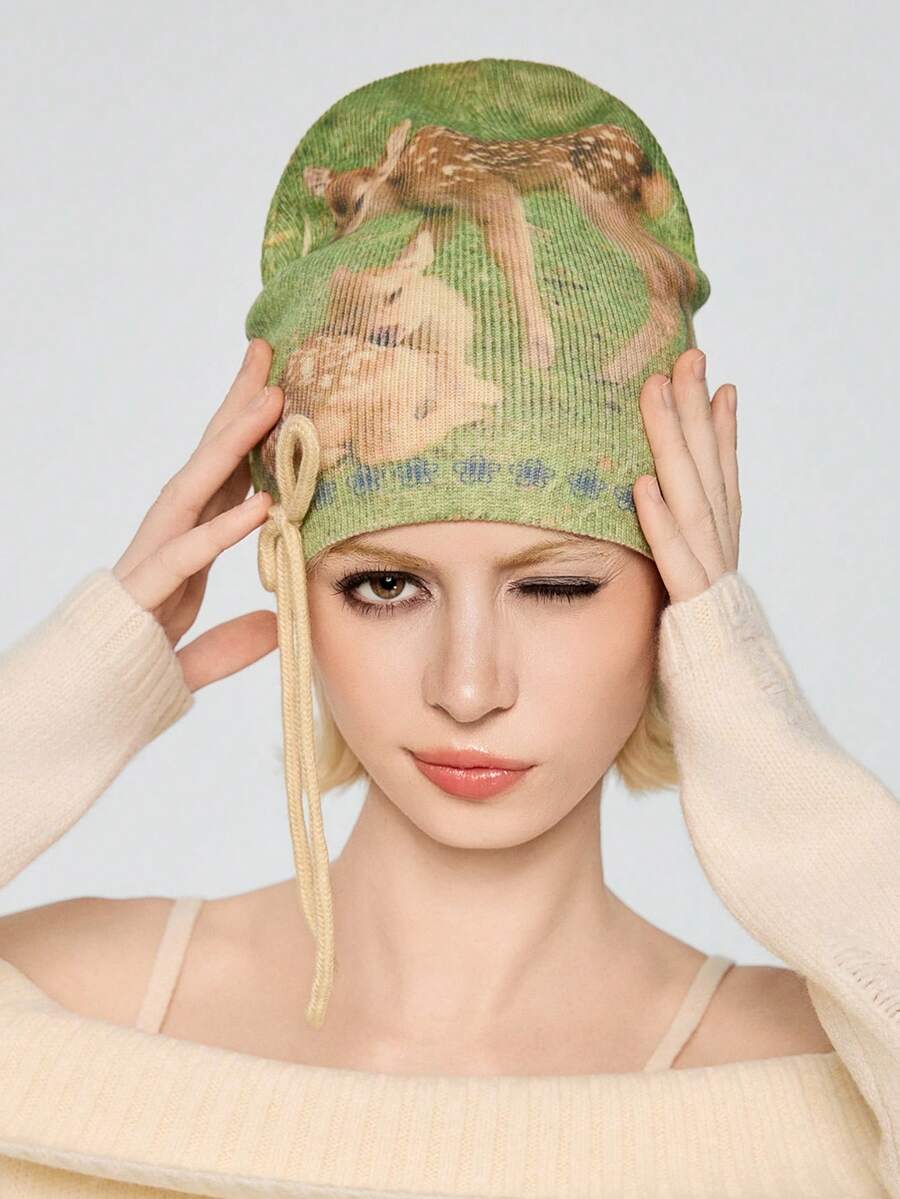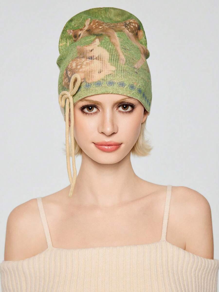 Fairycore 1pc Green Double-Sided Printed Deer & Floral Pattern Bowknot Knit Hooded Hat, Fashionable Minimalist Design Versatile Women Beanie, Suitable For Daily, School, Party, Shopping Outfits