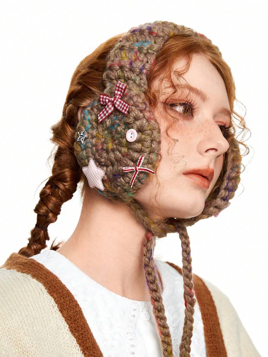 Fairycore 1pc Handmade Knitted Warm Ear Muffs, Niche Design Colorful Yarn Ear Warmers With Bow & Star Decor, Suitable For Daily Wear
