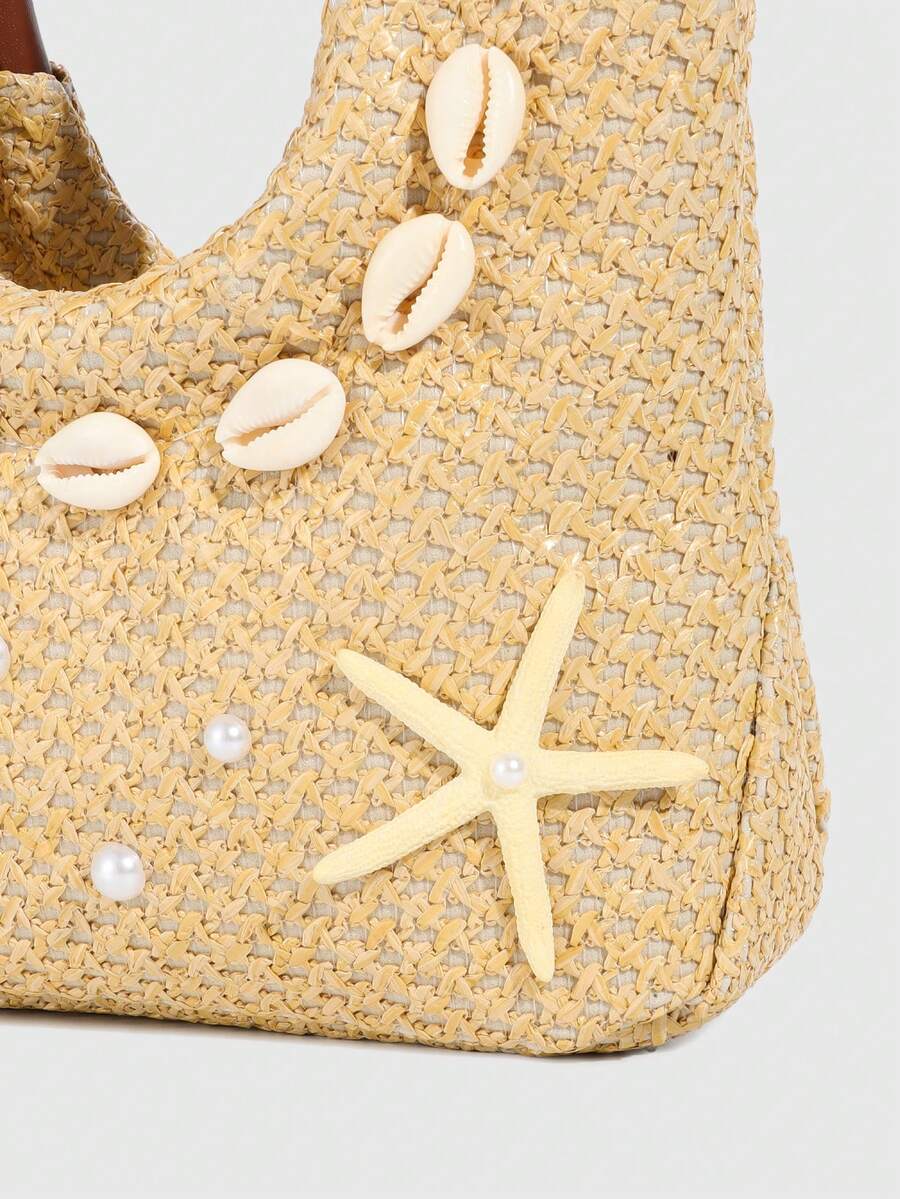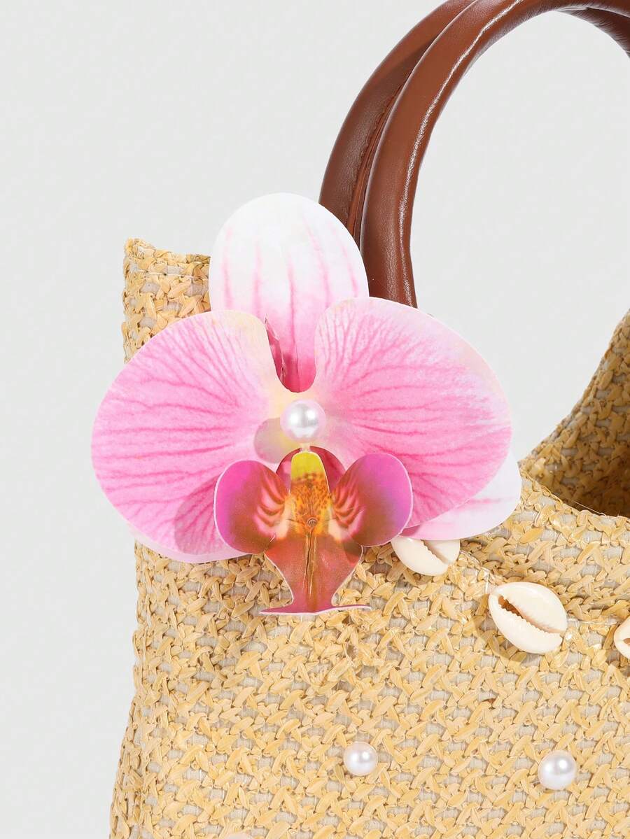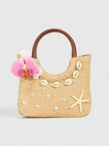 Fairycore 1pc Tropical Beach Vacation Style Orchid, Starfish, Shell Decor Women Handbag, Straw Woven Travel Accessory Bag