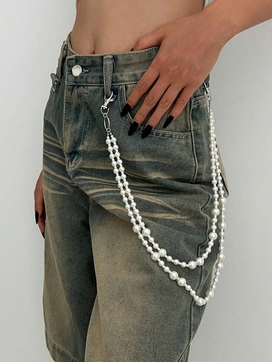 Fairycore 1pc Vintage Minimalist Asymmetrical Faux Pearl Waist Chain, Rhinestone Inlaid, Fashionable Charm Pants Chain For Women, Suitable For Casual, Music Festival Wear