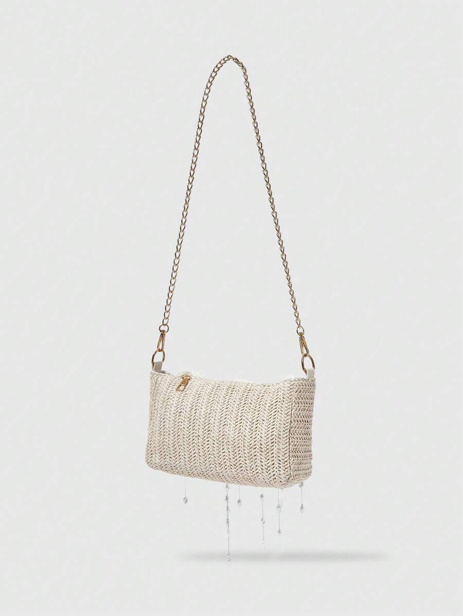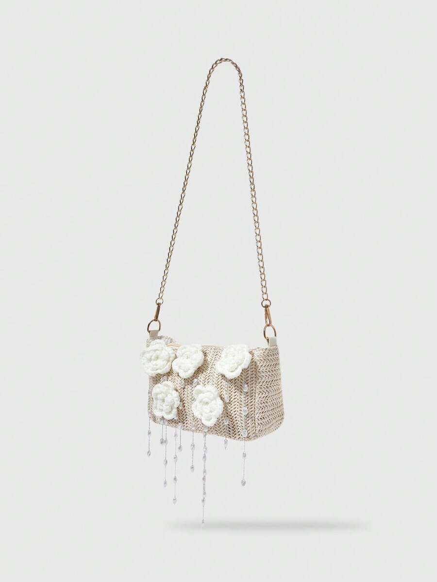 Fairycore 1pc Vintage Versatile Woven DIY Camellia Flower Tassel Pearl Beach Straw Square Crossbody Bag For Women (Includes 1 Bag + Accessories)
