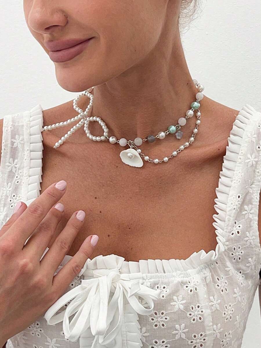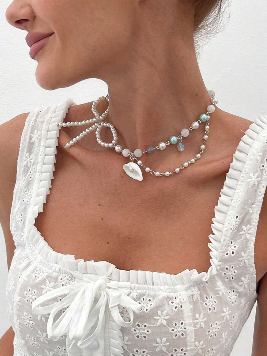 Fairycore 1pc Women Faux Pearl Bowknot Necklace, Stylish & Sweet