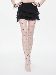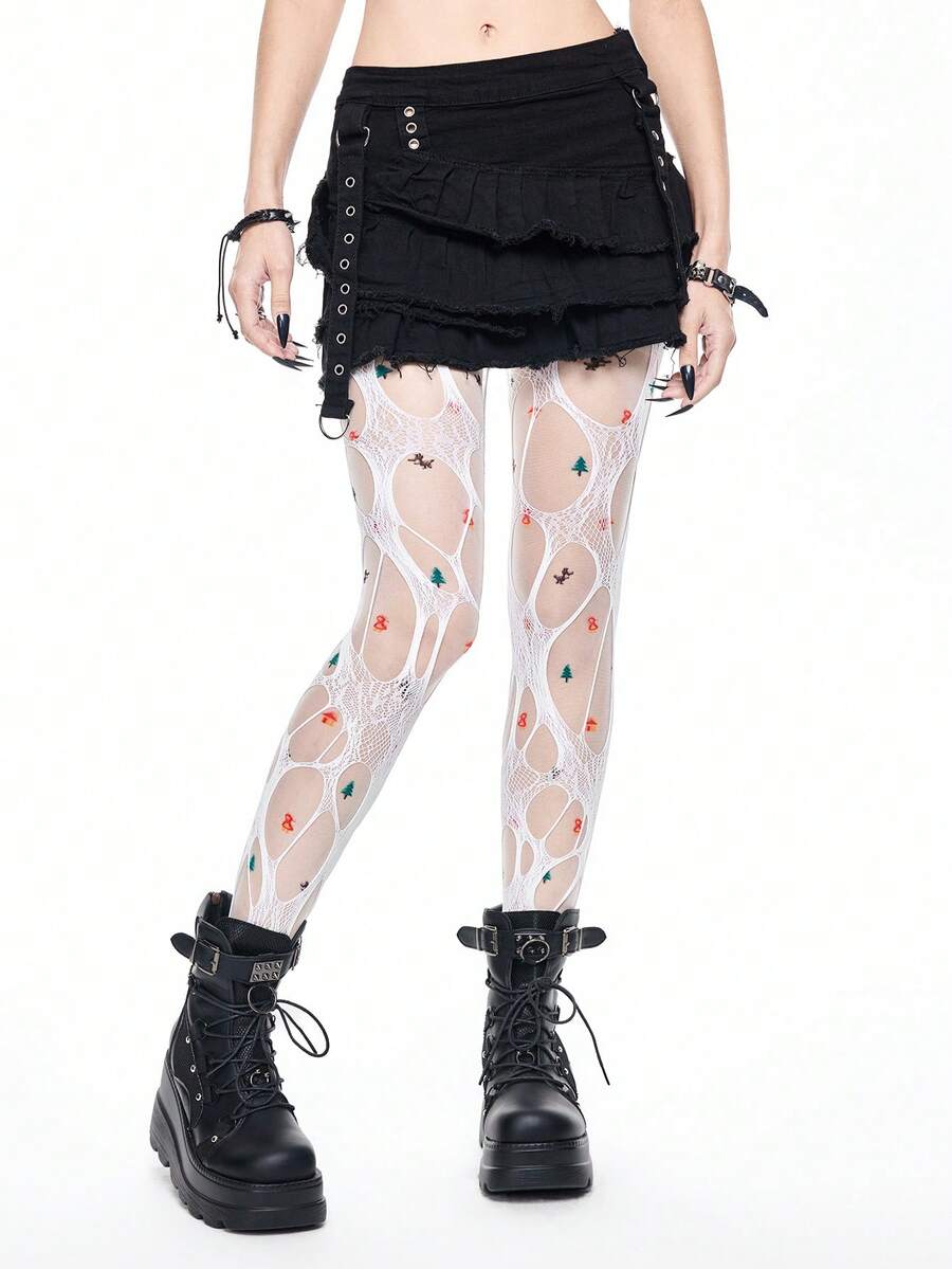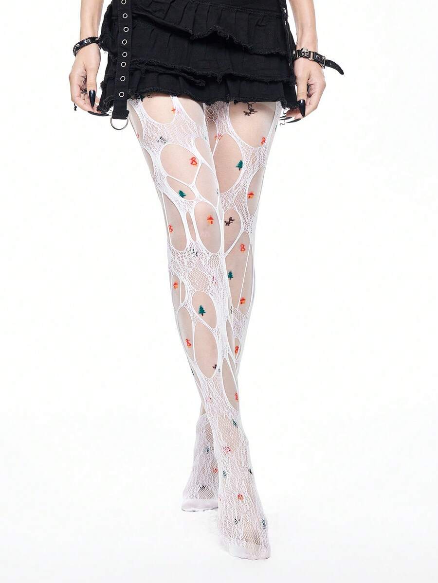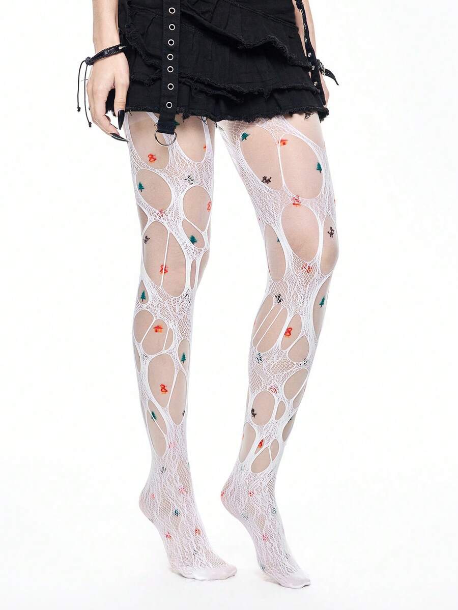 Fairycore 2 Pairs Dopamine Y2K Cartoon Print Sheer Christmas Tree Patterned Tights & Fishnet Stockings Combo, Can Be Worn Separately Or Layered, Suitable For Summer Music Festivals